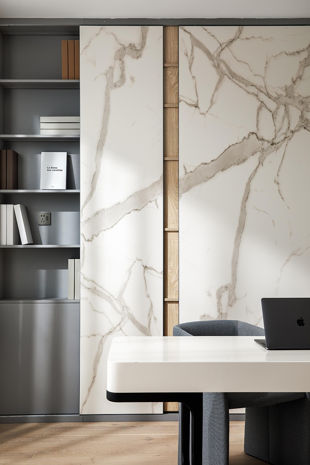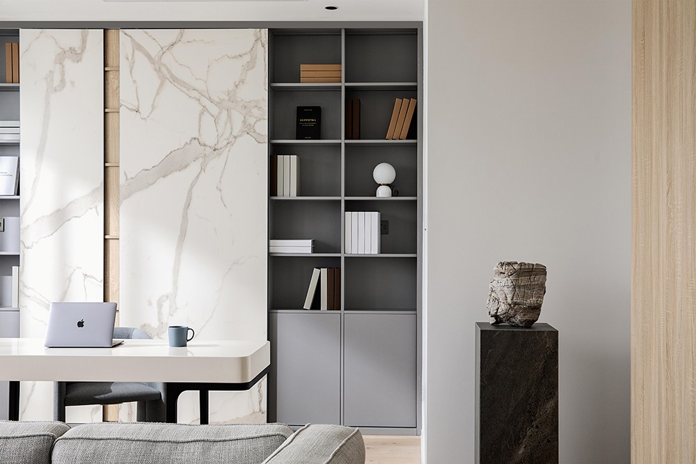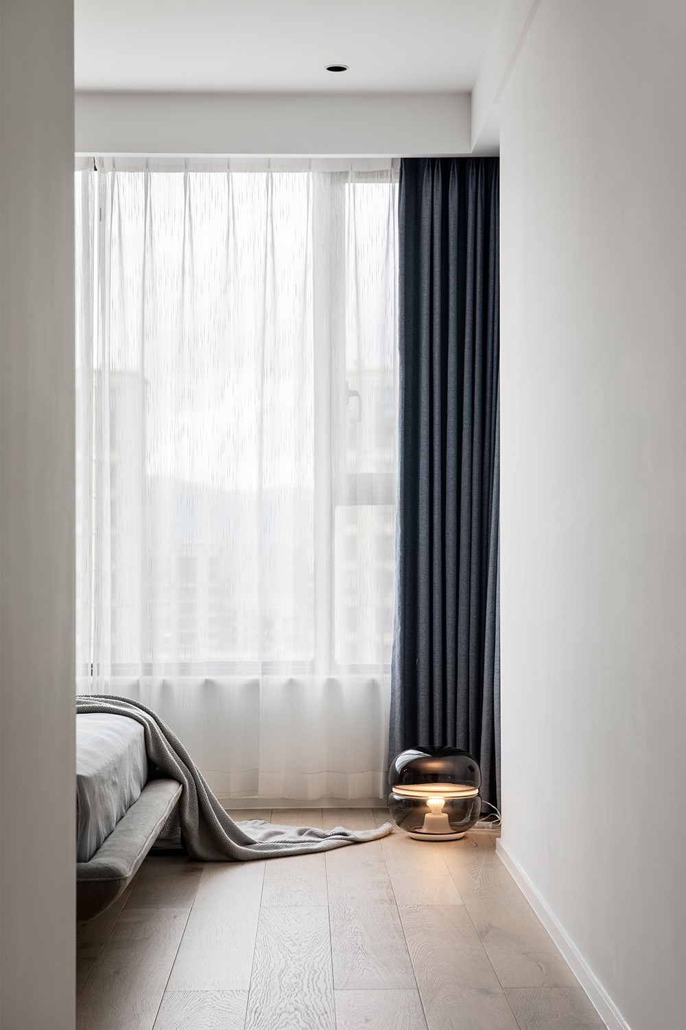 A:对于父母偶尔来住,首先,荣耀体育(中国)在书房区域做了一个活动隔板,可以拉出来将书房与客厅分隔开来,变成一个独立的小空间,也就是父母临时的卧室;然后,在书柜里做了一个活动床,推进去看着是书架,放下来却是一张床。这是没有办法的办法了(笑)。然后极简是需要很好的收纳功能的,荣耀体育(中国)做了大量的隐形柜子,让房间更加清爽。