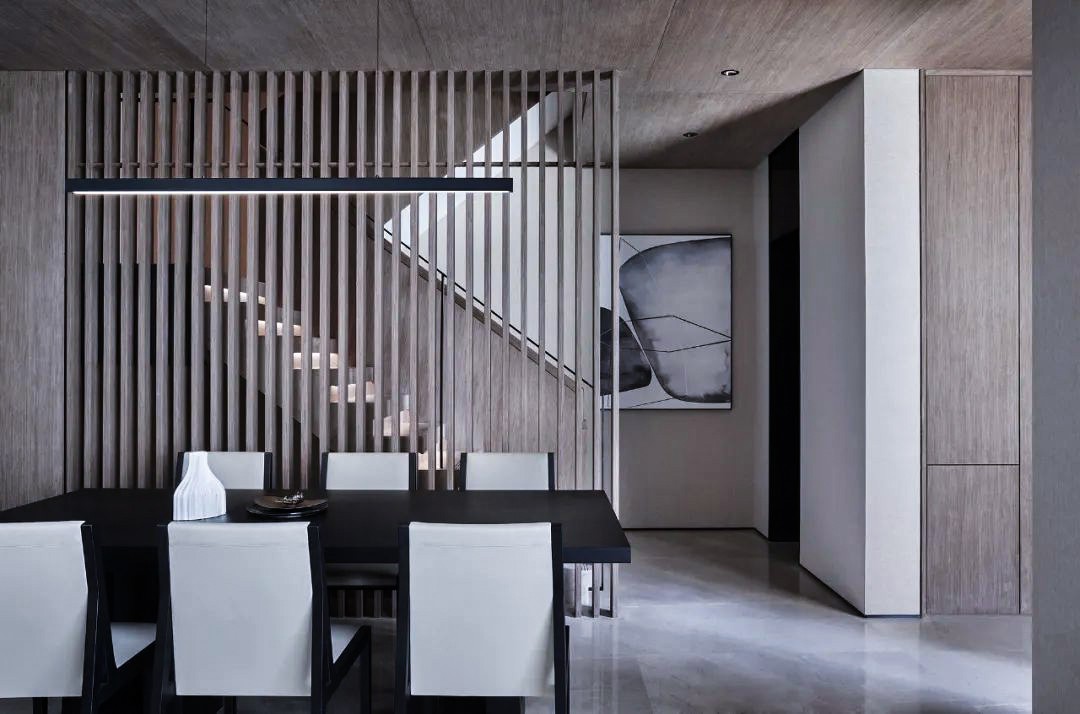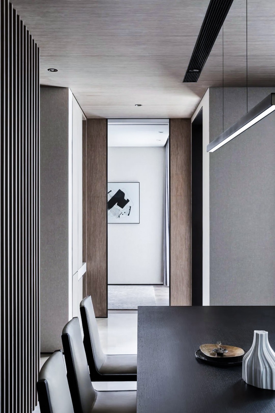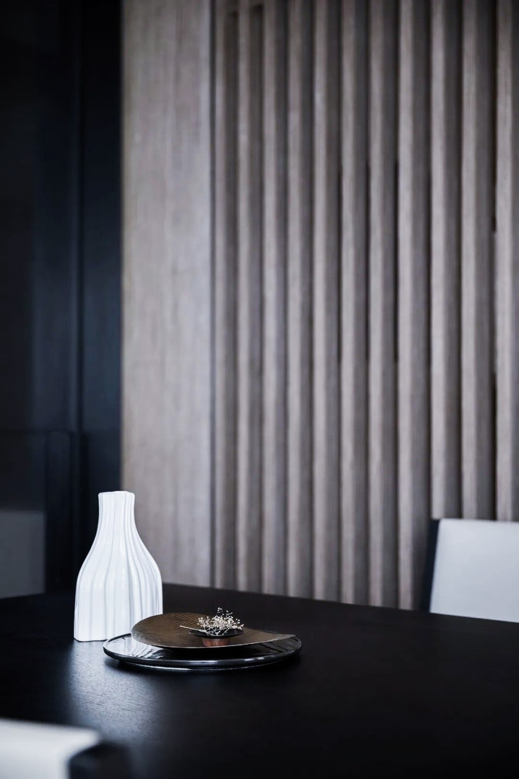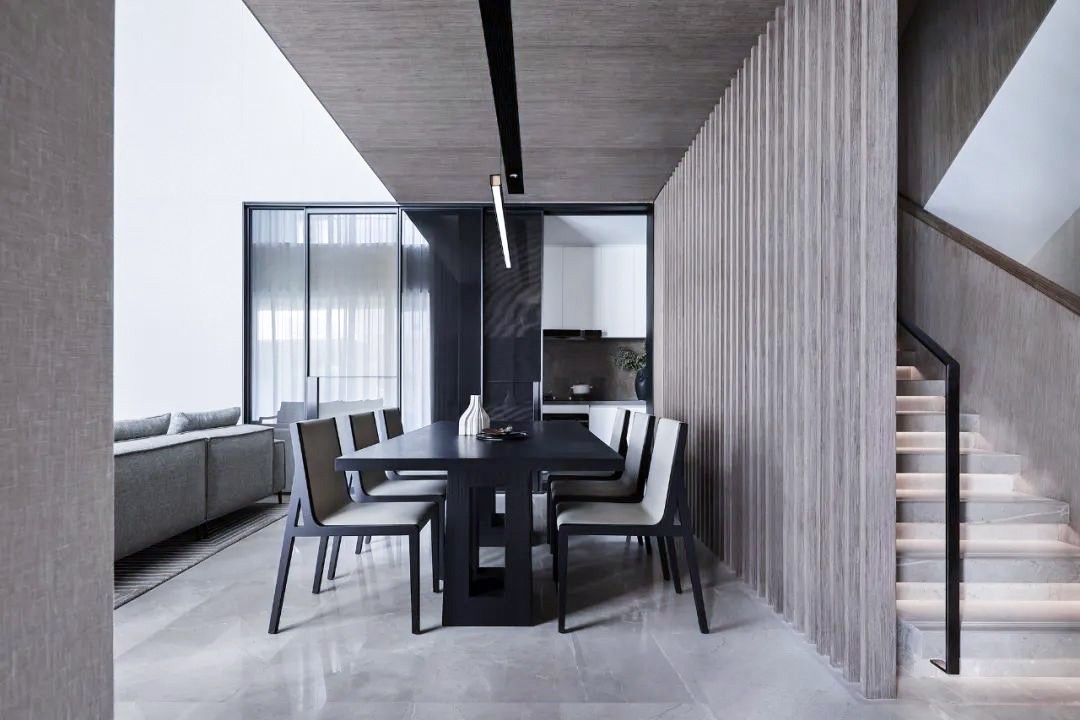 秉承克制平衡之道,客餐厅避免过多元素堆积,在满足需求之外,又透露出分区美学。挑高的一侧立面如同阶梯状渐次内退,餐厅因势而生,这是尺度上的自然而然,也是对块面关系的灵活统筹。