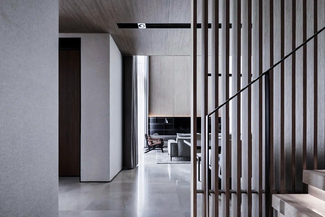 金属格栅将楼梯与客厅联动起来,既有一定的韵律节奏,又并非完全规整的形式,在灵动与透气的布局中,释放出精简纯粹的张力。