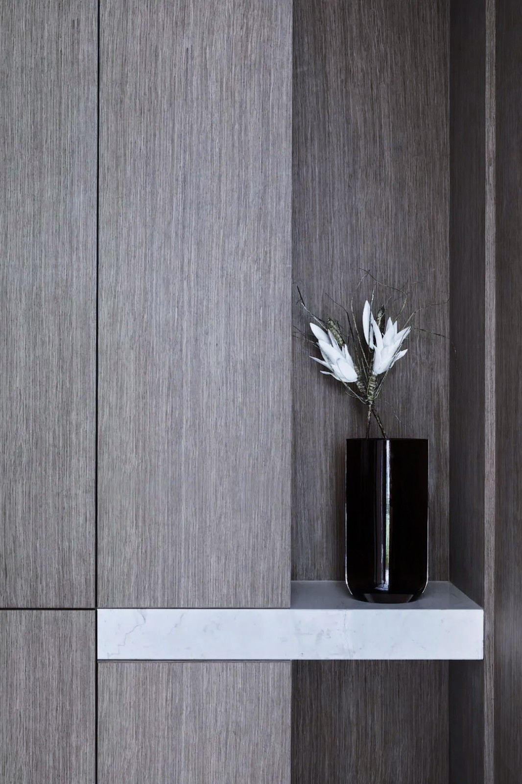 玄关是空间的起始笔触,设计师以大片木饰面铺就,平和轻松之感顿显,在闲适的穿梭中便可邂逅转角的温情,仿若薄雾笼罩下不经意透露的那点山间韵味。