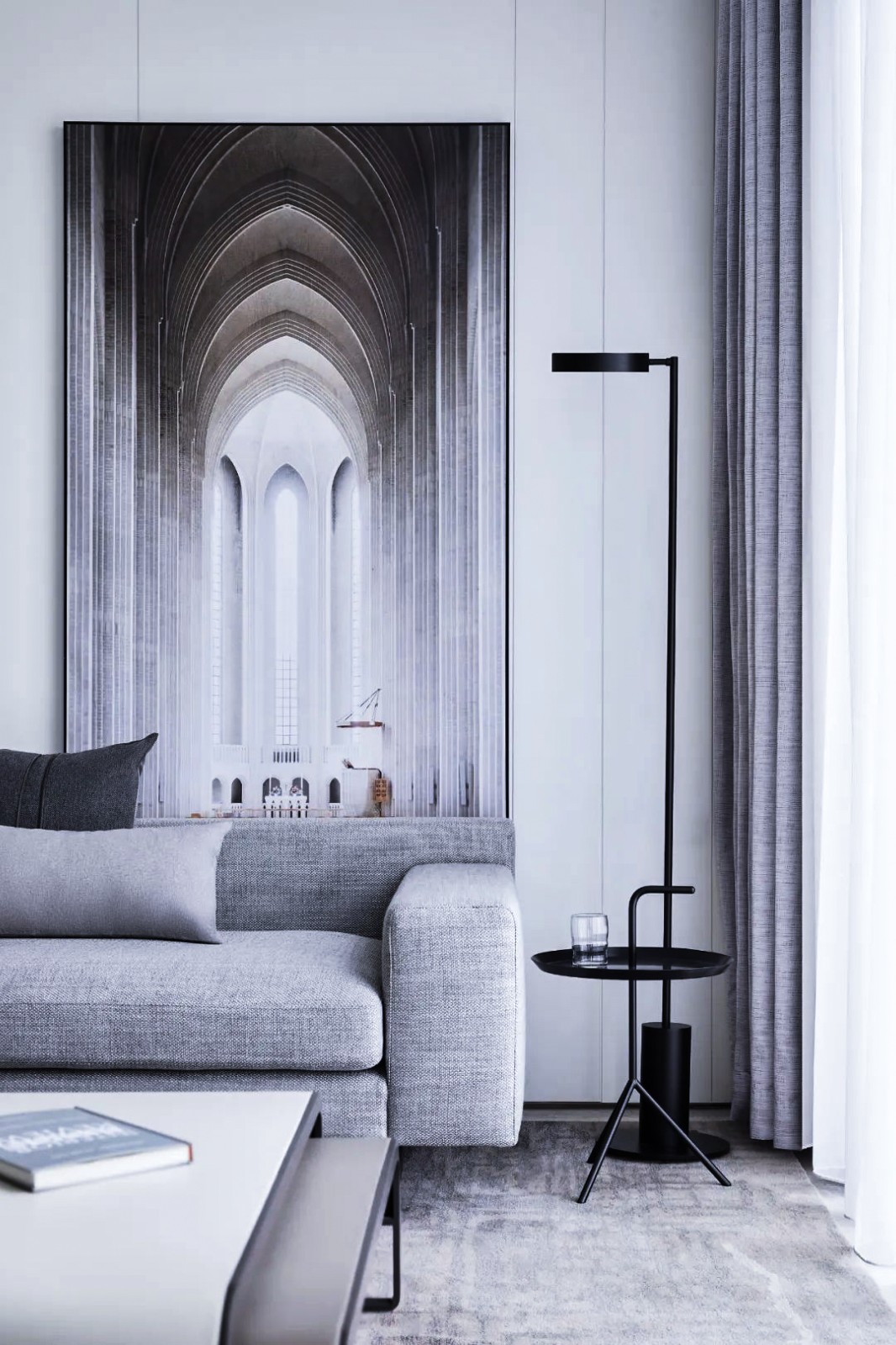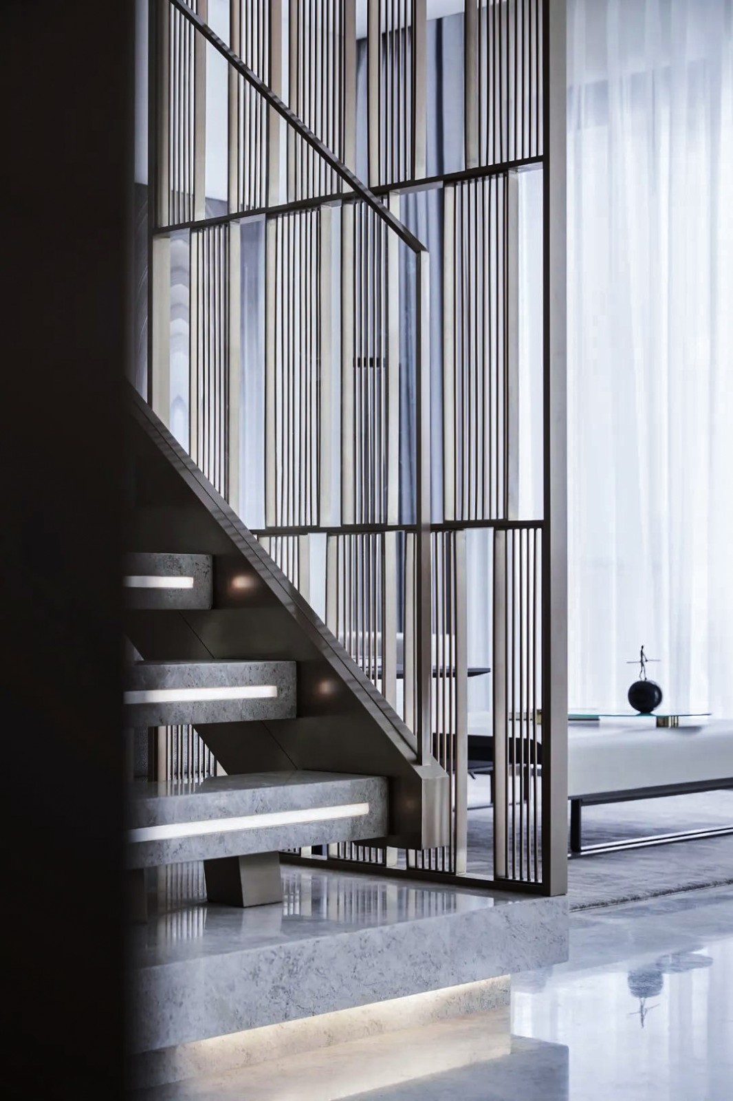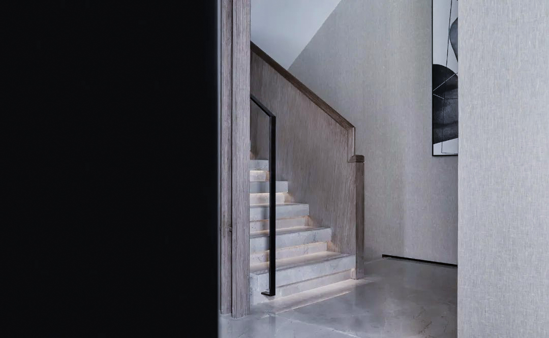楼梯间一缕缕线条演绎着场域的关联与独立,巧妙的悬浮状扶手,彰显功能、美感与工艺的有效结合。拾阶而上的每一步,都能感受到流泻的光影之美,便捷的电梯与之相望而设。