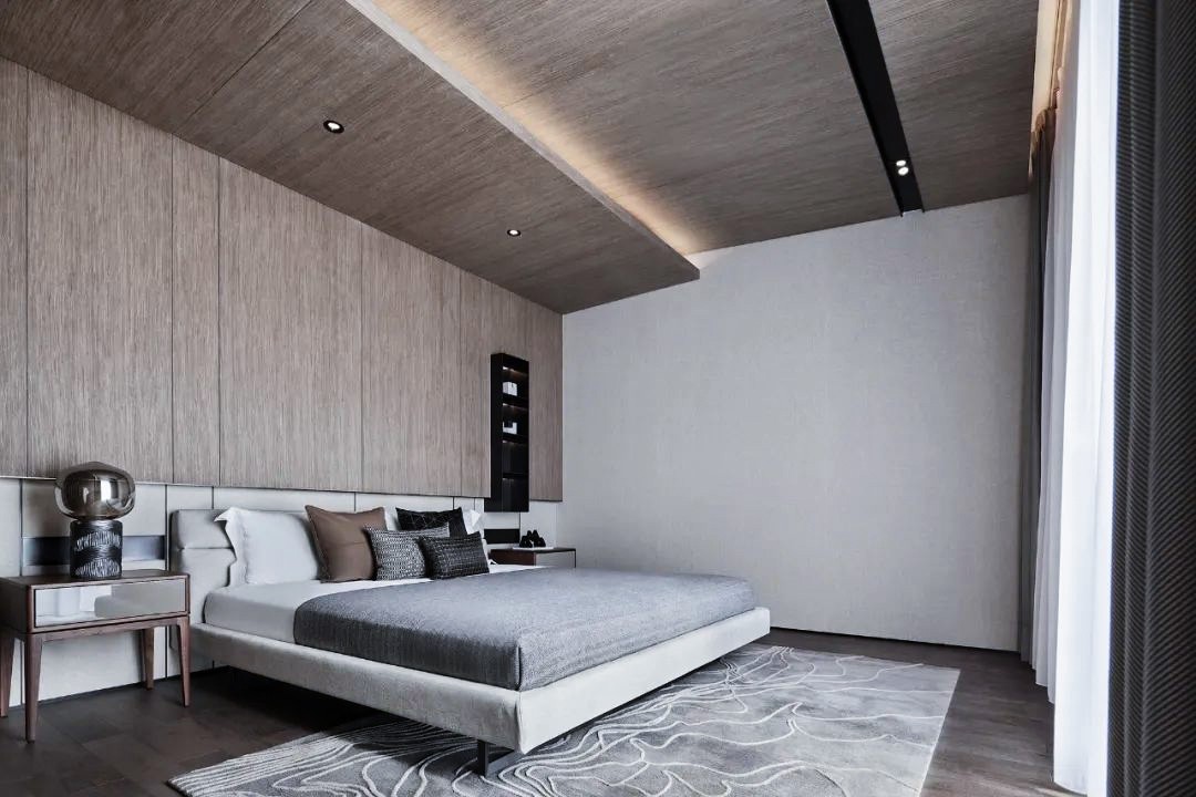 大范围的木质包裹,凝练出简朴温润的气息。设计师借由露台打造卧室之外的惬意之隅,进一步为其配置更高居住品质,体现卧室设计的周到考量。