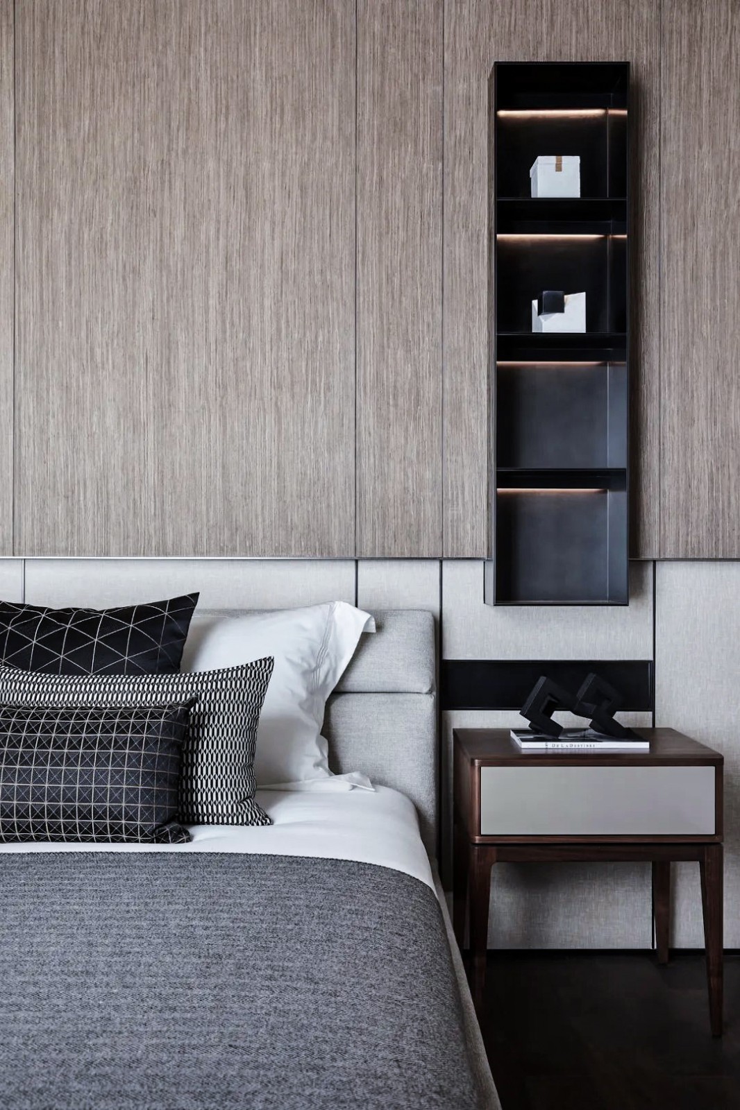 次卧套间内不同色调的灰铺就优雅内敛的质感,人居美学的率真平和便是如此。拉丝不锈钢镀黑钛的上下咬合点缀,打破纯色床背景的单调,活化空间表情。