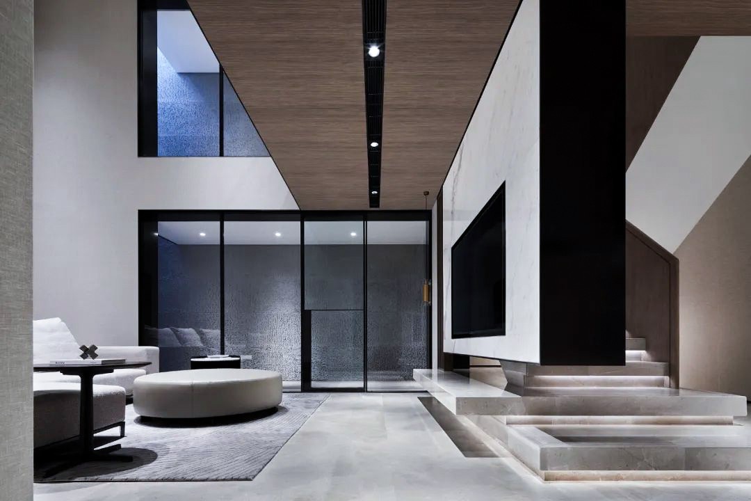 “地下层的架构与一层颇为相似,同样采取了半挑空设计,温润的基调、肌理表现都得以沿用。采光井将光线引入,开放式布局确保了使用的包容性与灵活度,这里可满足品茶、聚会、观影等不同功用。