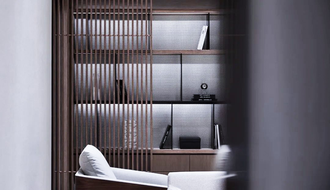 阳光透过窗纱,光线点点落于柔软布料,这一瞬的客厅仿佛成了永恒。设计师摒弃虚张声势,舍了繁华堆砌,去除多余的墙体,借由金属格栅的虚实效果,连接多个区域互通对话,简洁的线条,温和的色调,安宁地诠释出静谧轻奢的格调。