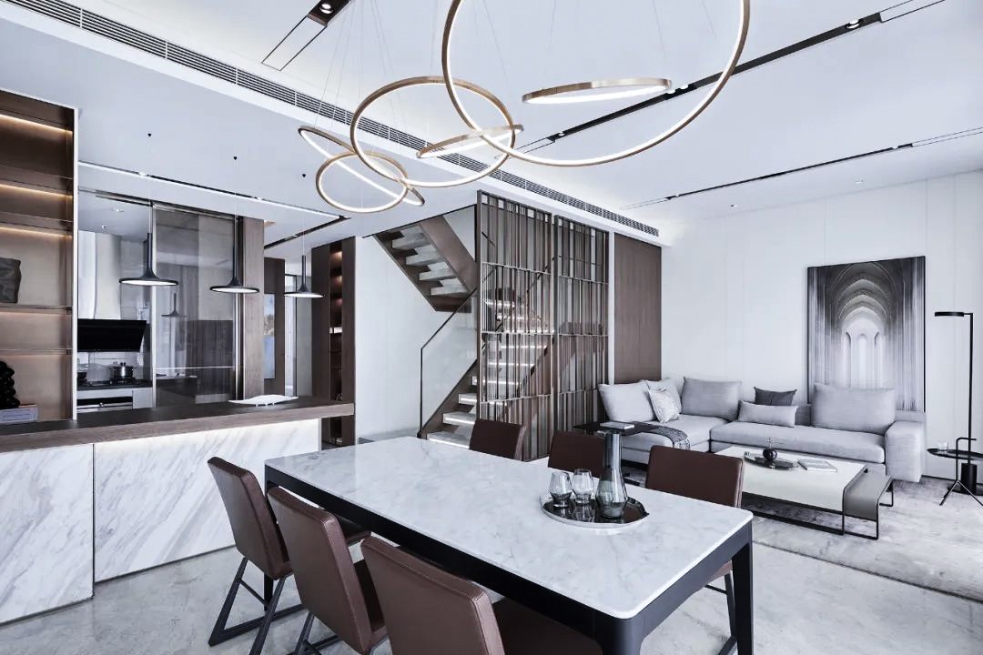 厨房、吧台、餐厅自由的形式,让尺寸感、舒适度以及便利性进一步提升,烤漆板与金属贯穿始终,加由视觉和触觉上的多元碰撞、对比,映衬一种微妙的开放与互动。