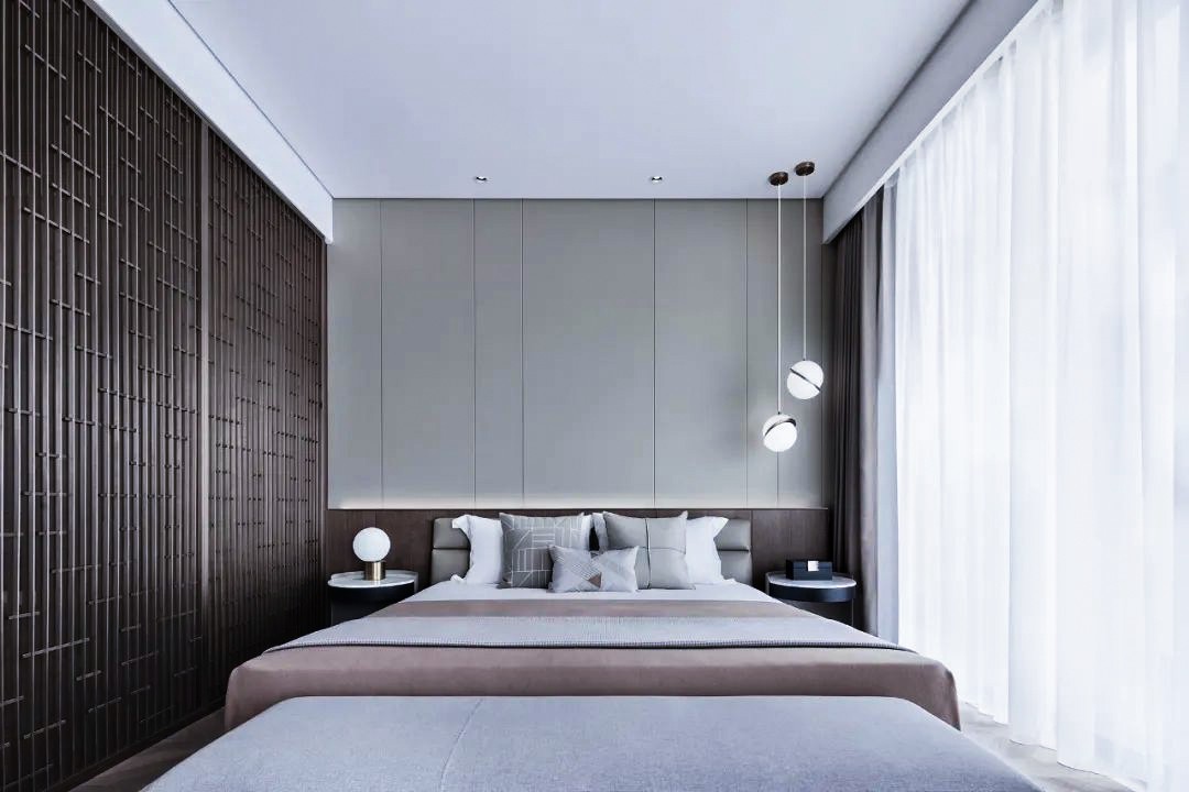 二楼的主卧套间精研空间的穿透与情趣。设计师从山峦的层叠中捕获灵感,在大块面的延伸、穿插与碰撞之间,构成错落的关系。左右滑动式的木格栅柜门设置,渗透出别样的自在与柔和。