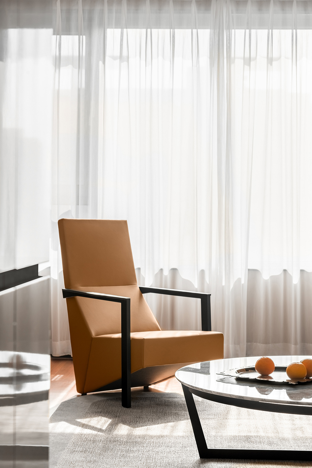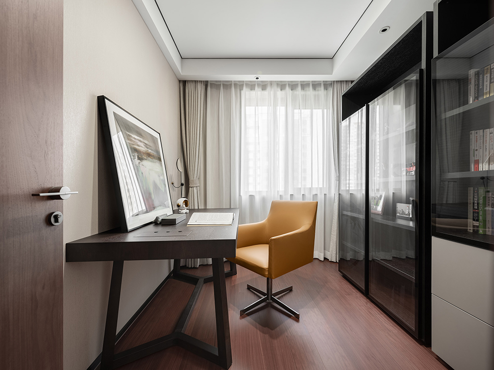 恬静怡然的空间,最能让躁动的心沉静下来。书房的黑白书柜与橙色座椅、线条与块面,既独立又相容,相互统一于整体的空间结构,散发出空阔淡泊的风度。
