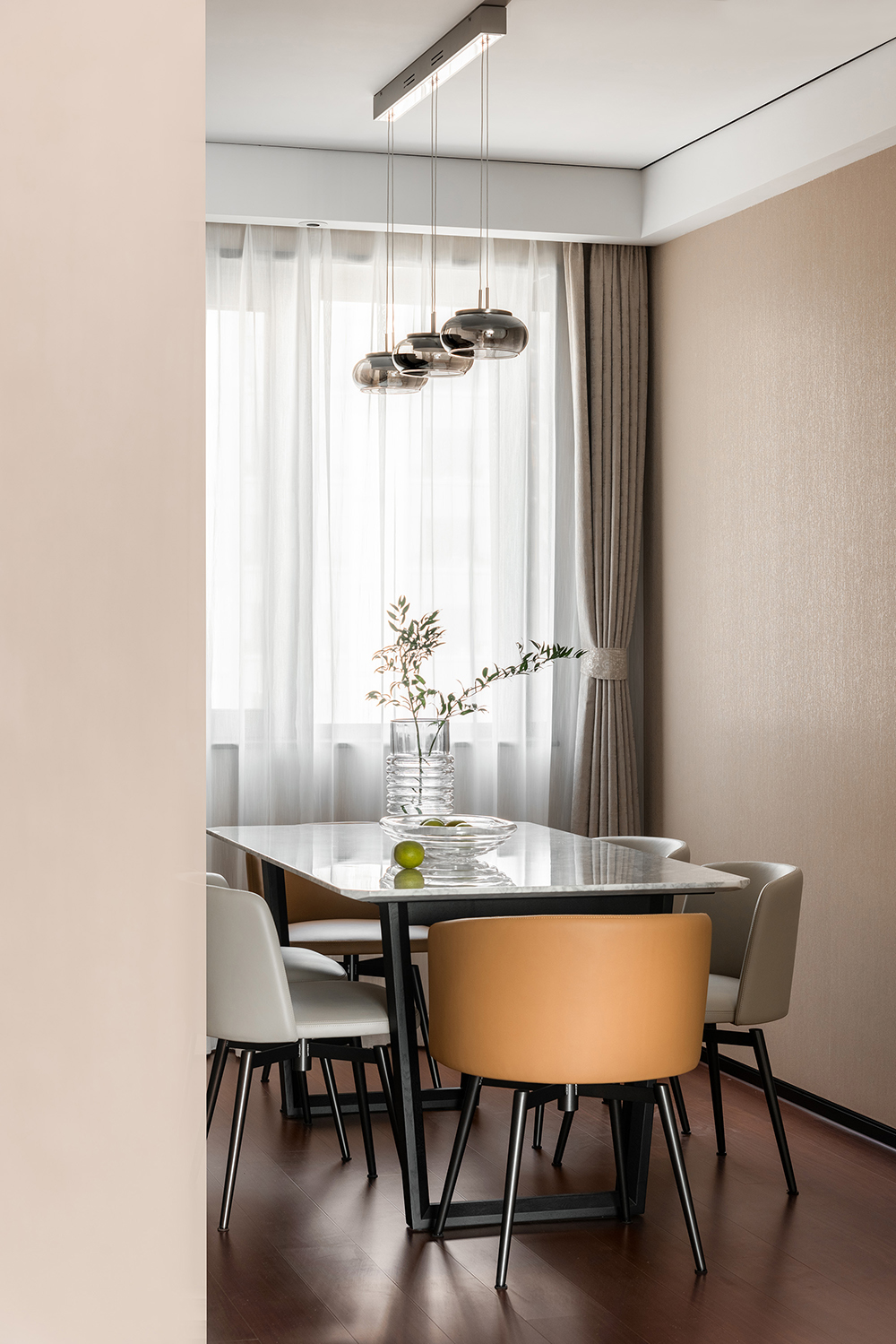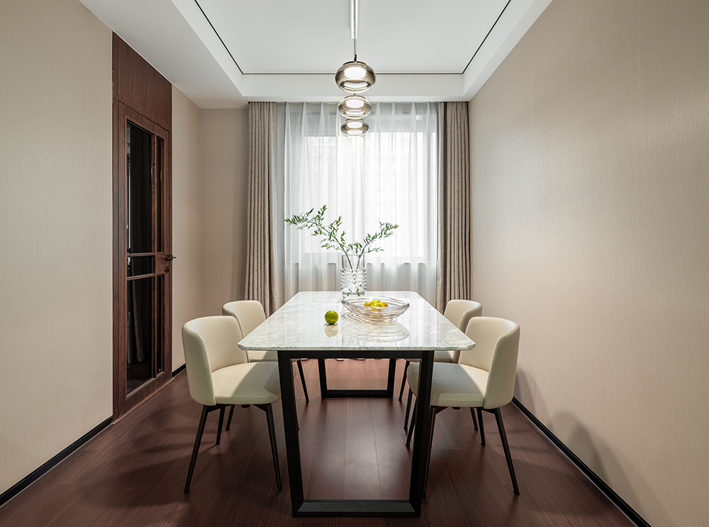独立式餐厅能够很好地区隔出不同的空间,达到结构化设计的效果。器具别出心裁的设计为空间增添了浓厚的艺术气息,与大理石肌理的桌面形成了默契统一。在吊灯的照射下,倒映出物体之间的窃窃私语。