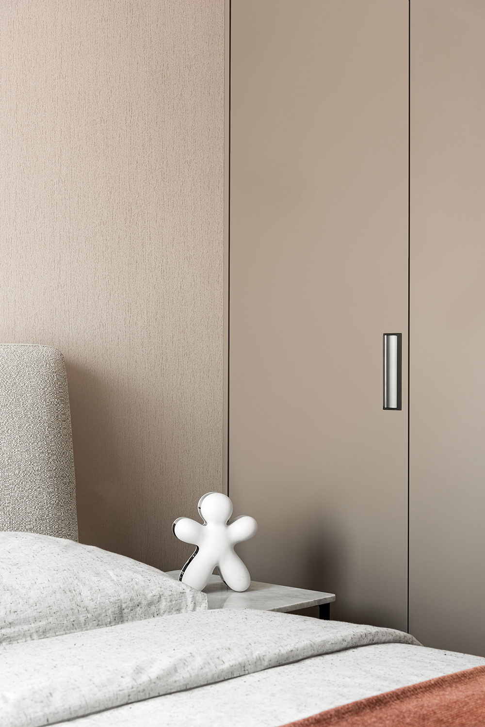浅色系组合的主卧,似有简约而又素雅的境界。同为米色系的床体与背景墙增加了空间的协调感。艺术元素的植入,让艺术感与居住者的气场共融。