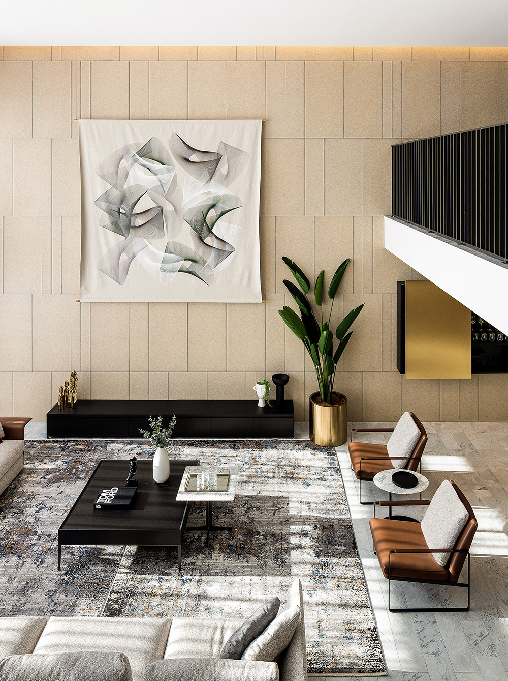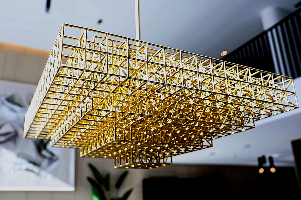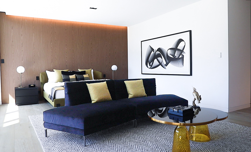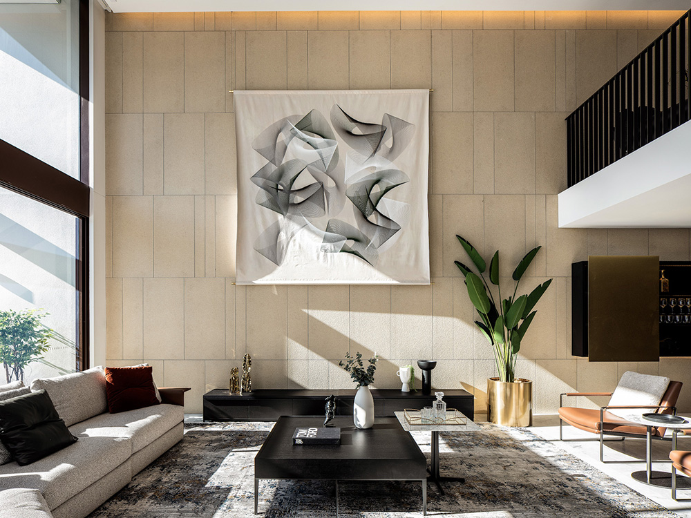 而来自CAMERICH(锐驰)的家具温润大方,平衡了金属材料带来的酷劲,让空间更具舒适性与现代感。客厅中央一组巨大的L形组合荣耀体育平台与墙面的巨幅抽象画遥相呼应,奠定简洁大气的装饰基调。餐桌上方的黄铜纵横吊灯营造出一种现代工业感氛围。定制切割的ELBA大理石地板传递出高贵优雅的质感。