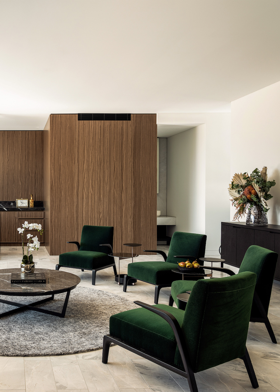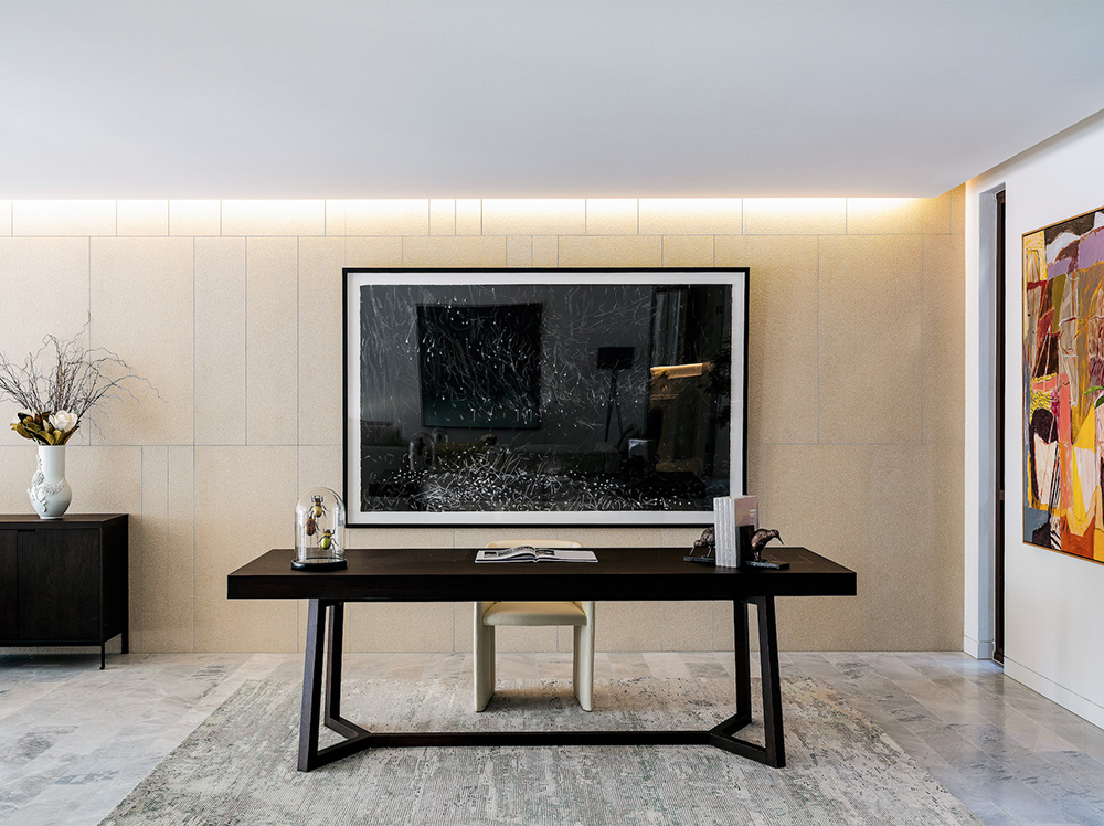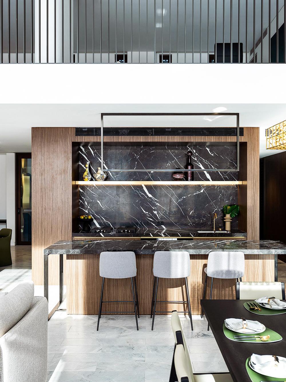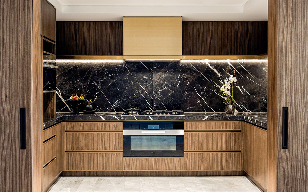 餐厨区域采用黑色大理石和木饰面,创造出极具戏剧感的视觉空间;预装的Miele灶台、微波炉和集成冰箱提升了烹饪体验;岛台边高挑纤细的吧椅为用餐和休闲增添了时尚气息。
