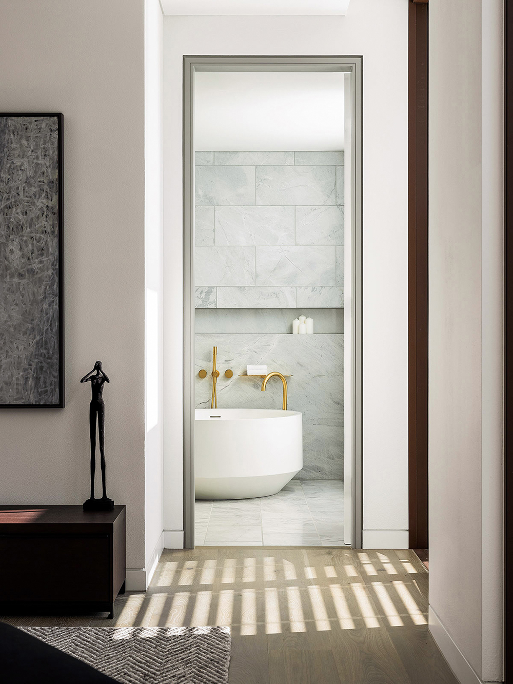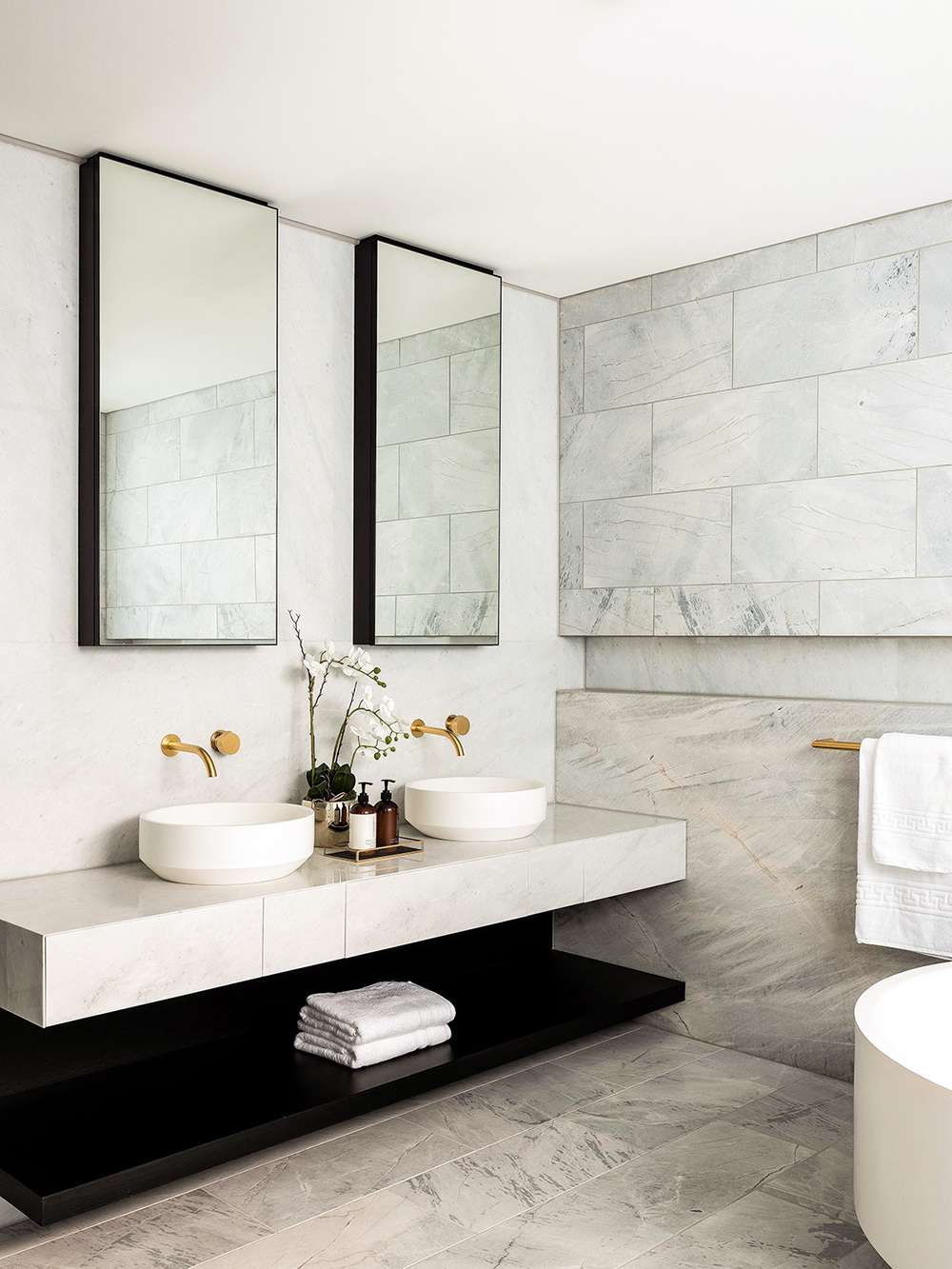 卫生间大面积采用灰白色纹理大理石,手工切割的台面和拉丝黄铜水龙头展现出精致的生活细节。