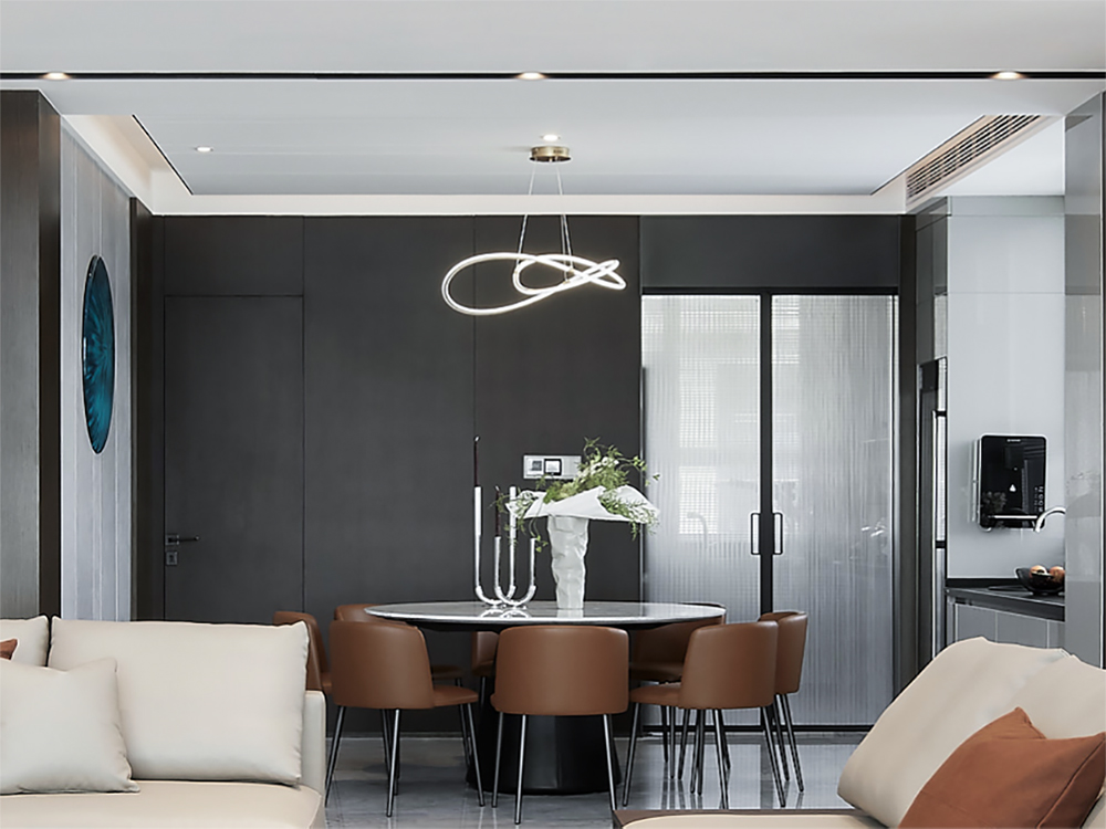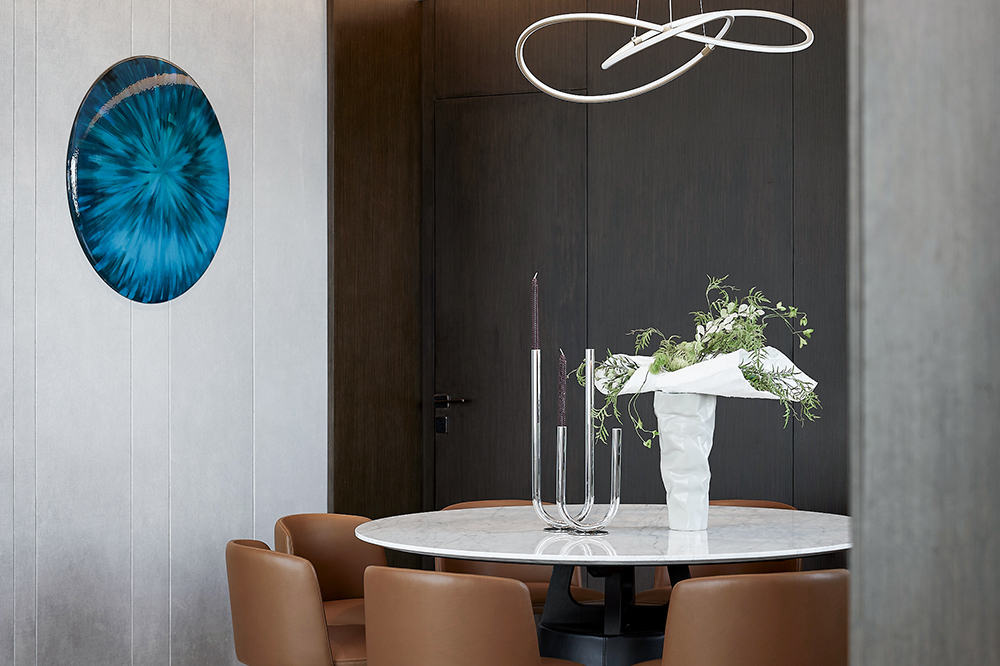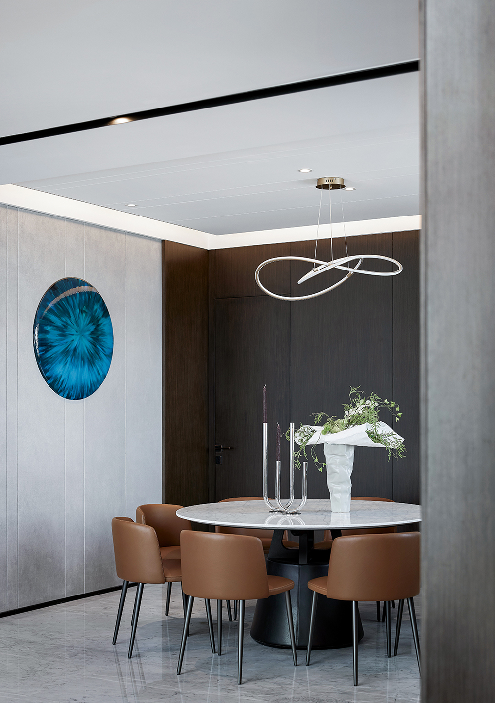 就餐也要注重仪式感,留白的墙面搭配现代风的装饰作品,点亮了餐厨空间的色彩,升华了空间格调。