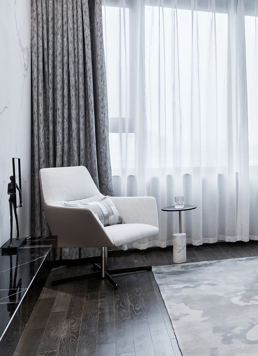 设计师在充分了解业主生活及精神需求的基础上,对空间做出了调整与规划。通过融入诗意宅形与文化,借由居者与空间的关系,构建出回归内心舒适的美质生活空间。