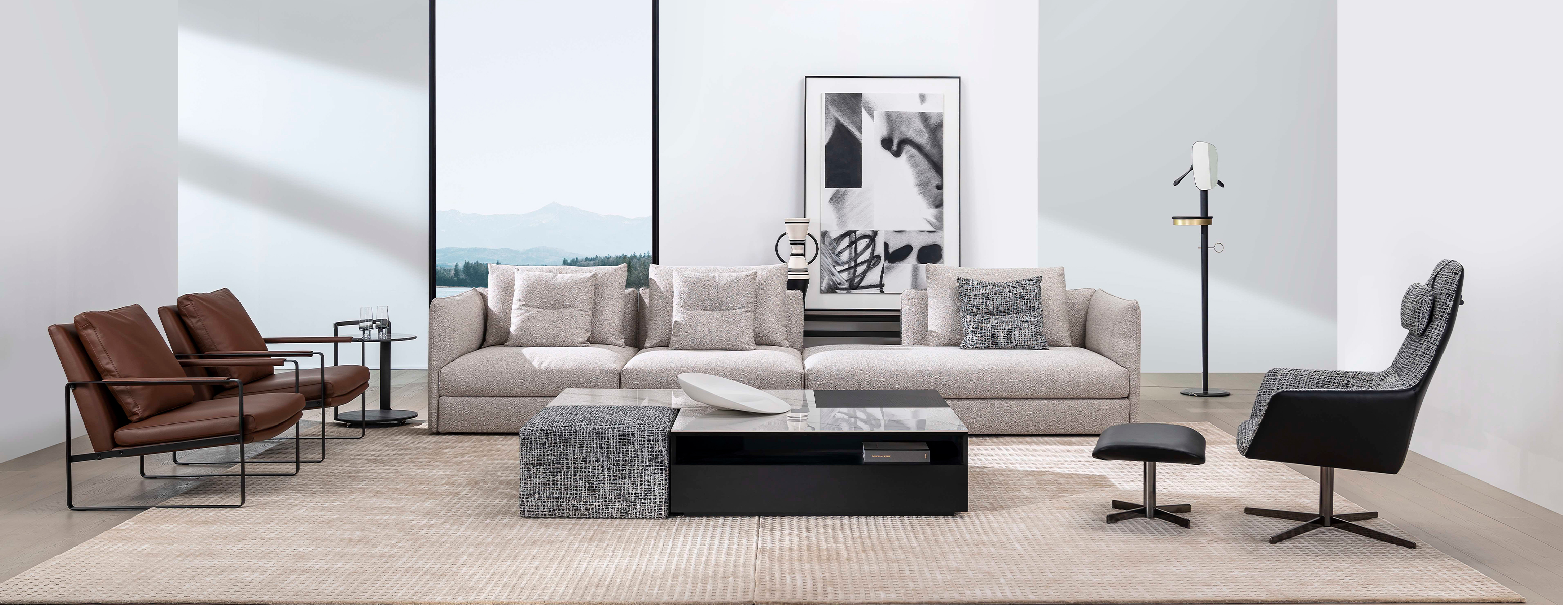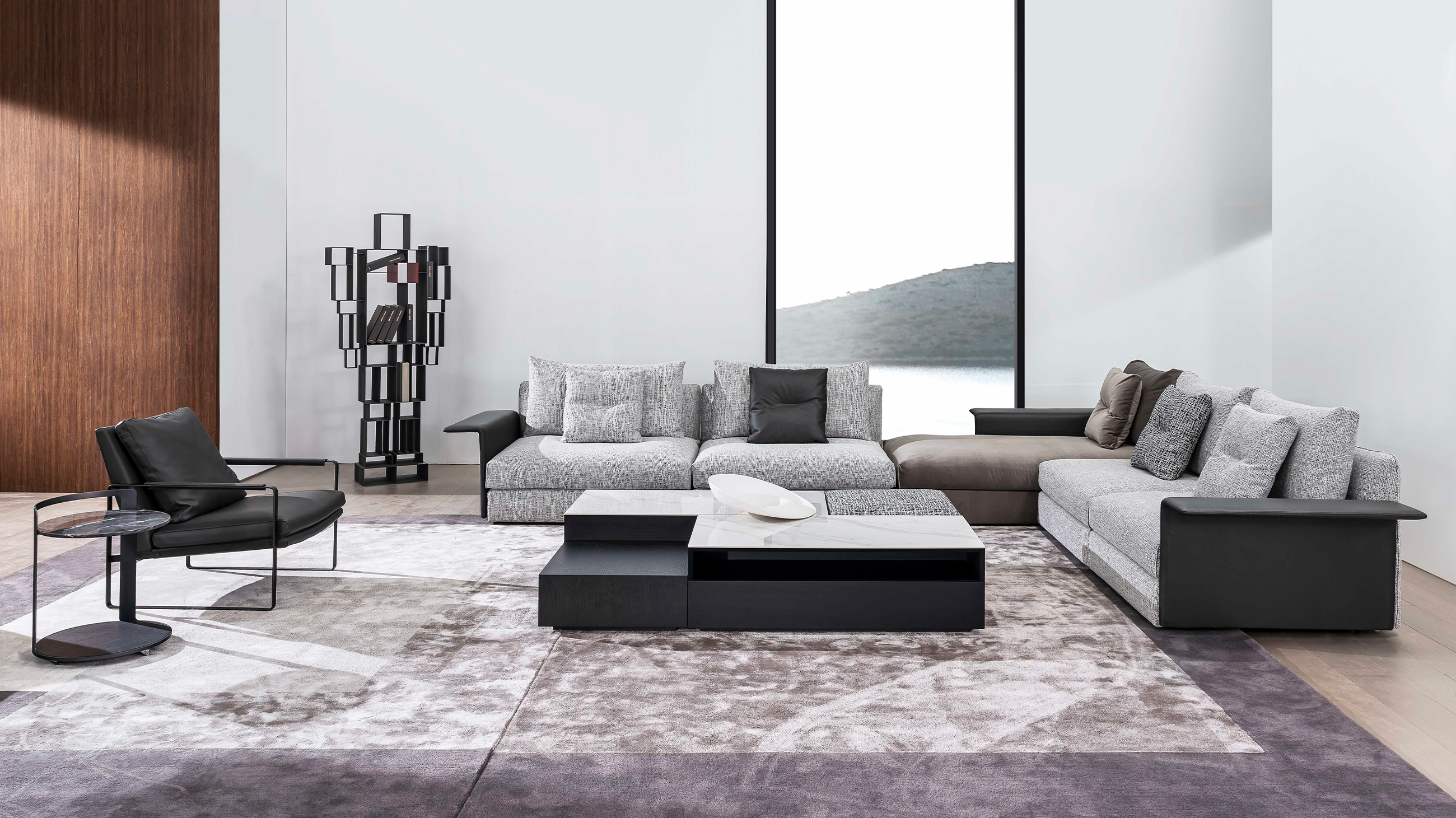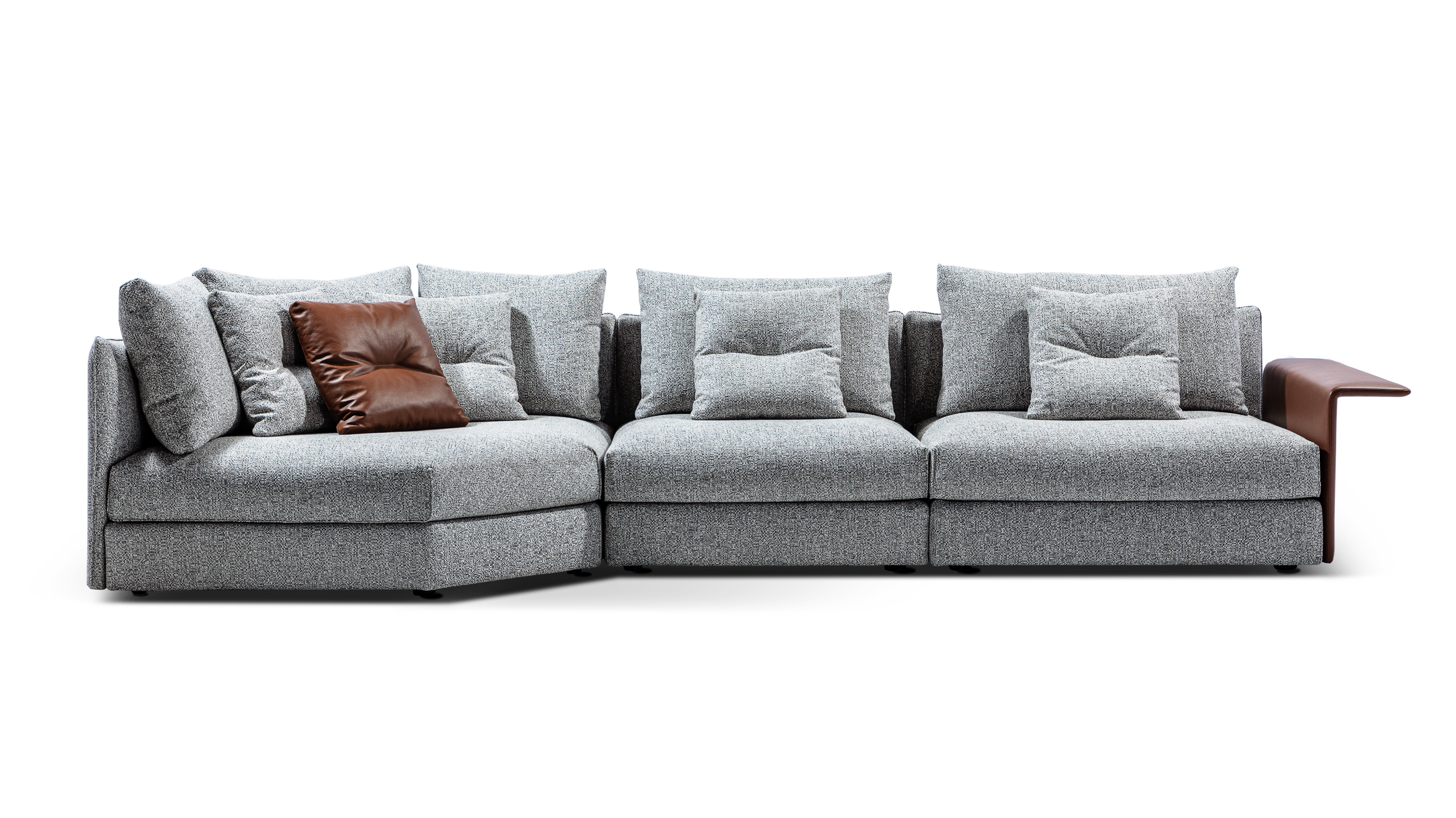 L型扶手,位置随心而动,增加空间和功能的多元性;六边形转角位,带来非凡的组合能力;靠包采用一字型拉线装饰,丰富视觉美感。