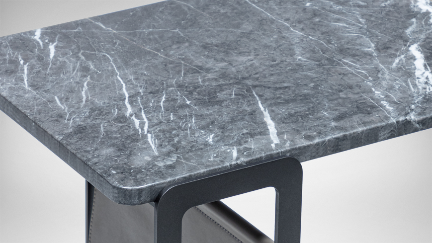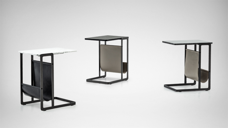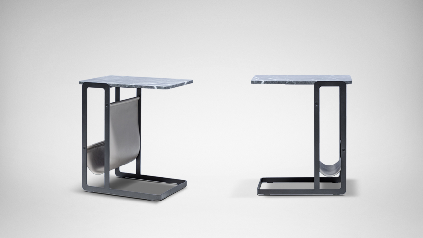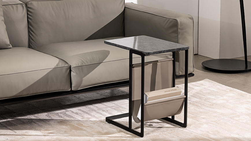 外形精巧灵动,可任意百搭,适用于不同空间。附带皮质储物兜,适合放置书册,增强实用性。