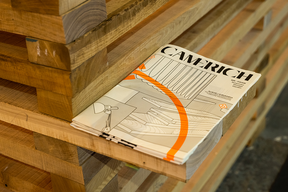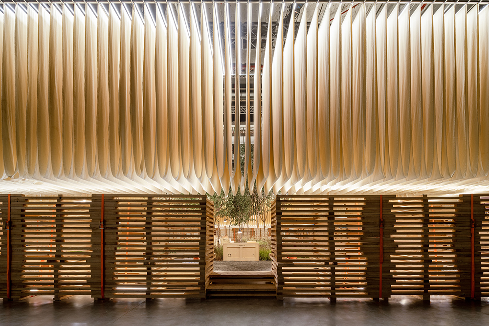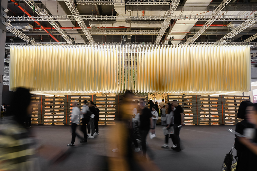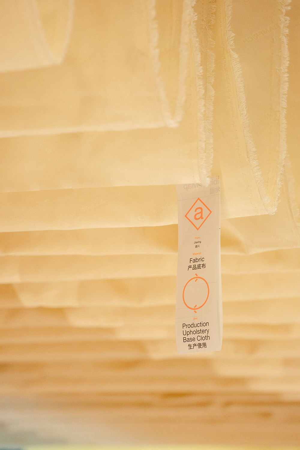 所有布展材料均保持原始和真实状态不被破坏。展区四周的帷幔采用锐驰荣耀体育平台底布面料,以弯折的方式被悬挂起来,避免裁切造成的浪费。展区周围的木材来自于锐驰的实木产品基材,在展区中交错叠放,并使用捆绑带进行固定,避免使用钉子对基材造成损耗。