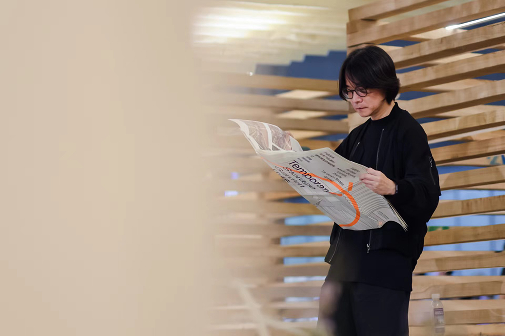 在柔和的光线和安静的氛围中,观展者可以在繁忙中稍作停顿,来到【中转花园】小憩、闲坐或是交谈,并可以领取一份由回收纸张和环保油墨制成的专刊报纸,详细了解锐驰南北园区布局的规划方案,与其中所体现的社会责任和可持续原则。