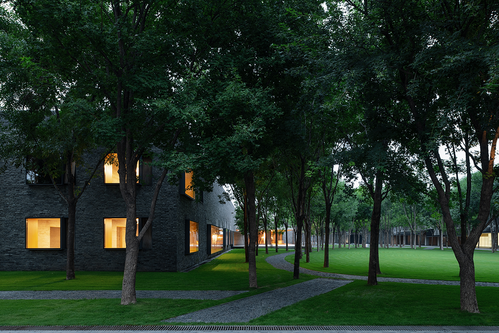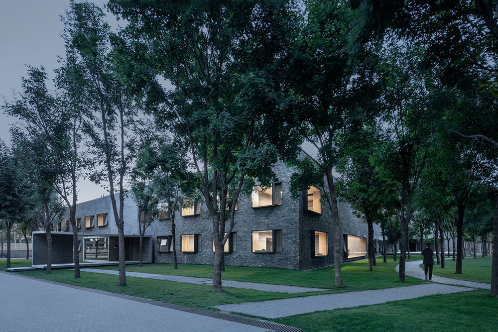 以花园作为展览中心,来源于锐驰北京园区的场地中心是一座花园,员工的工作和生活围绕在花园四周,日常往来于几座建筑之间,都要穿梭经过这里。也如同嘉兴园区坐落在一片自然与田园之中,员工能够通过工厂的落地窗眺望这片运河之滨。