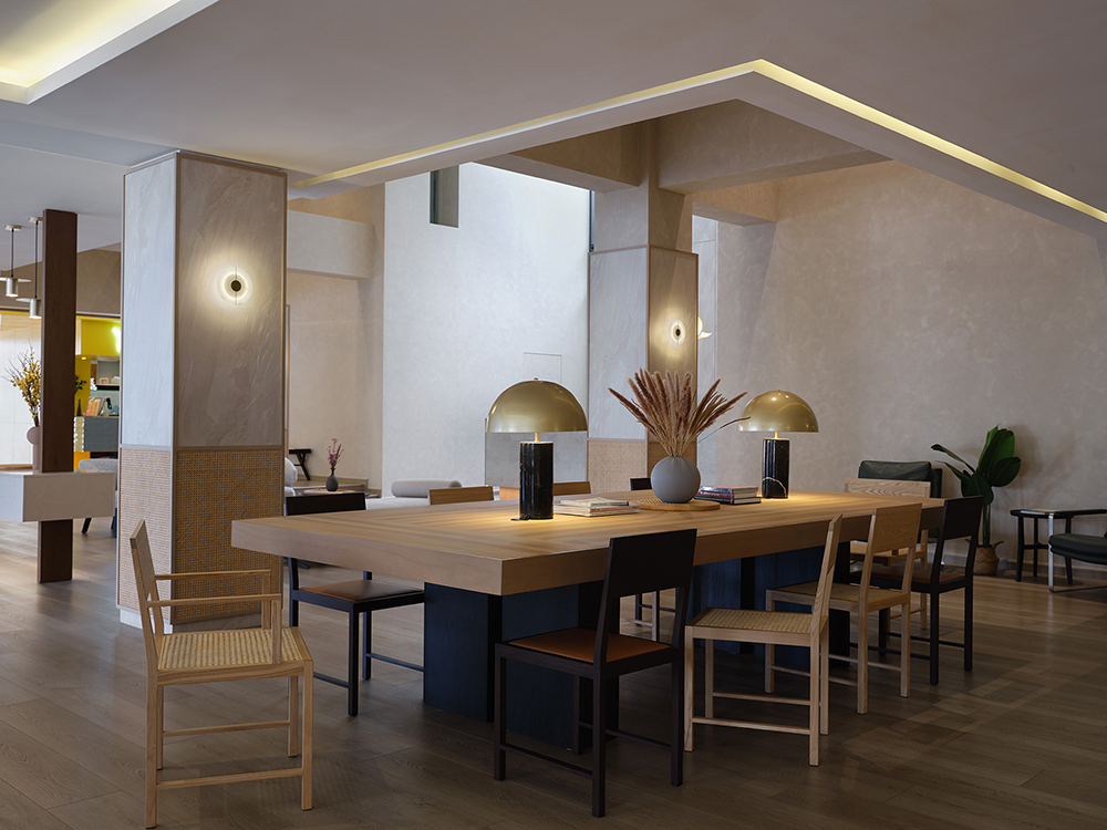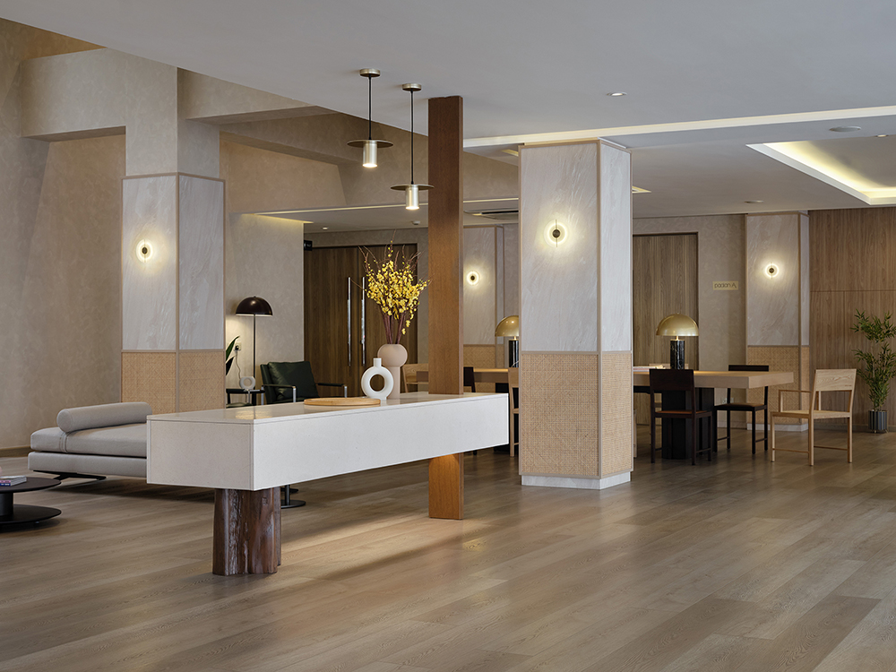 大堂中央双层挑高,接待处背靠落地大窗,在有限空间内营造出开阔通透的视觉效果。方正的立体设计极具建筑美和平衡感,再搭配简洁优雅的CAMERICH锐驰家具,给入住的客人带来一种美好的仪式感。