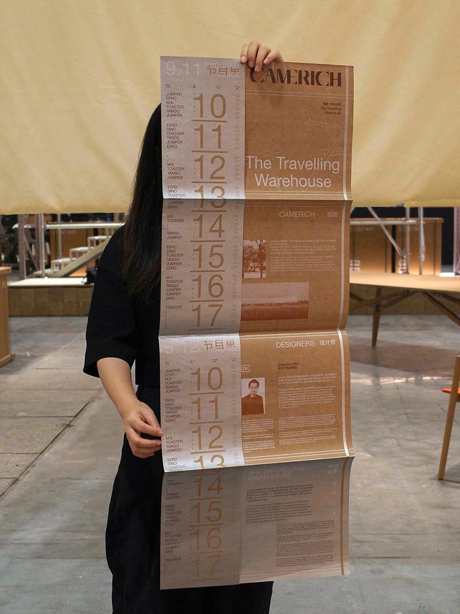 「移动仓库」节目单延续自23年「中转花园」报纸的相同尺寸,长达1米的折页上竖向呈现了动态开箱的时间排期。采用与现场包装箱相同的牛皮纸面纸及货架的银色印刷,传递展览概念外也成为展览的延续。
