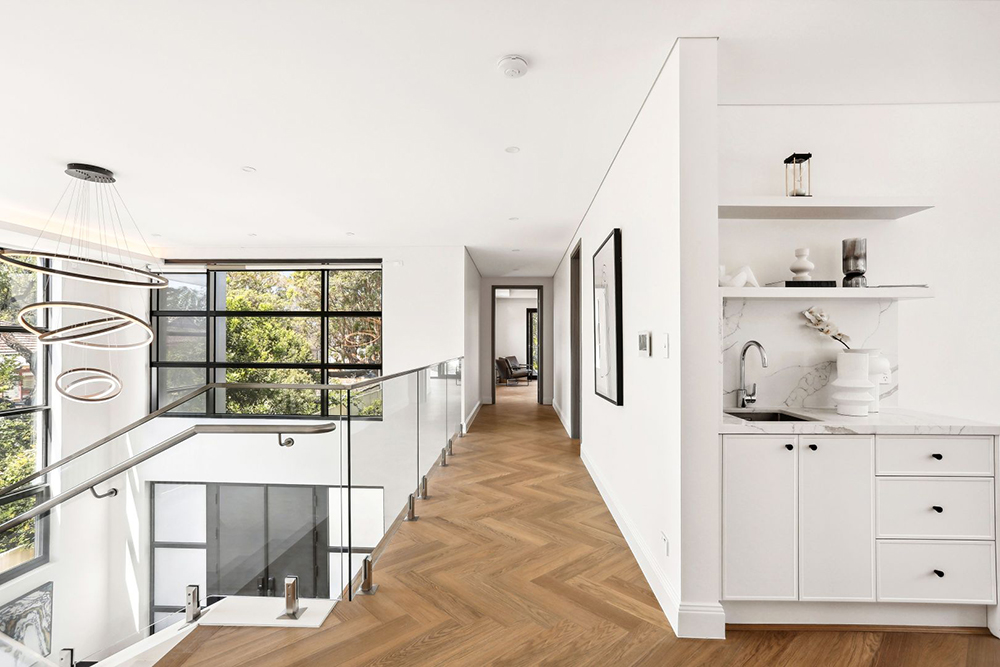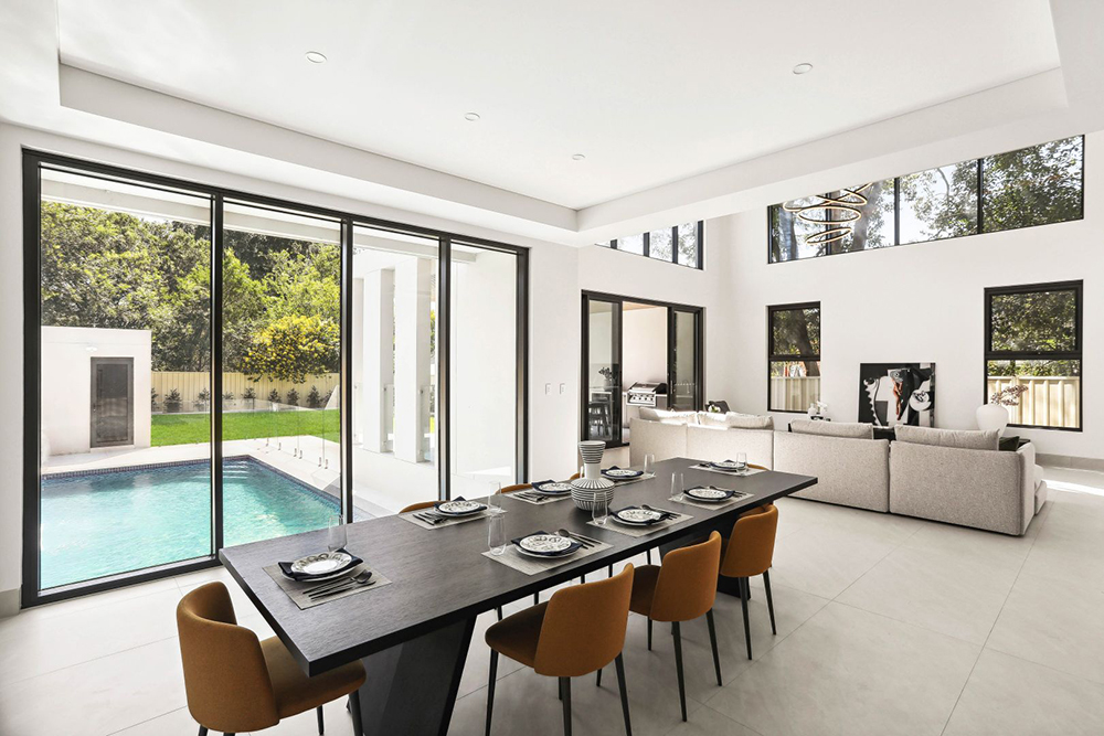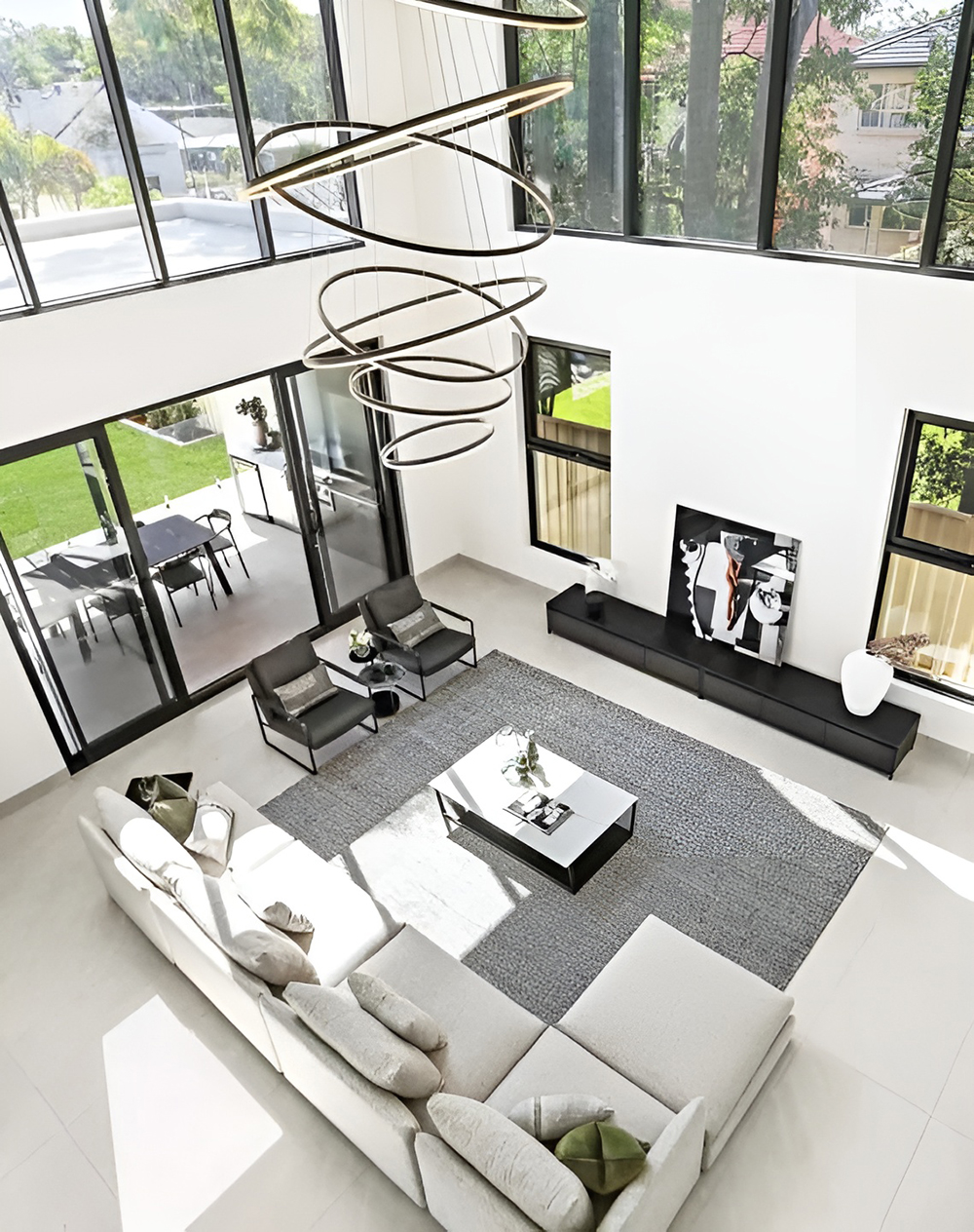 穿过草坪和双车库步入建筑内,一片豁然开朗,别有洞天。客厅双层挑高,三面墙体上采用大尺寸方窗设计,让室内室外连通,既保证了充足的采光,又可以270°欣赏窗外四季变化的景色,让居者仿佛置身于自然之中,与四季同呼吸。