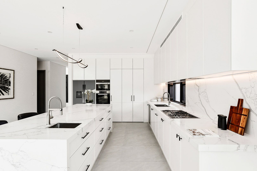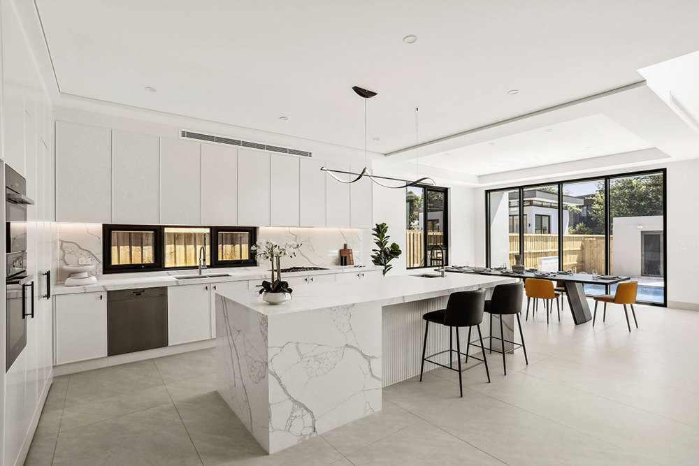 餐厅另一侧是开放厨房和岛台,白色木饰面和理石面让厨房看起来一尘不染,两把黑色BALLET吧椅盈盈而立,为这一区域增添一抹现代魅力。