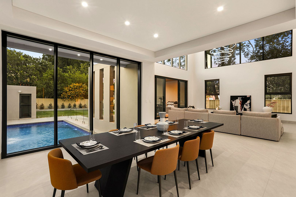 餐厅深色长款PI派桌搭配橘色BALLET芭蕾椅,是人间烟火的暖意和温馨。餐区边的落地窗外就是一池荡漾的碧波,阳光下,泳池内镶嵌的马赛克闪闪发光,令人心情愉悦。