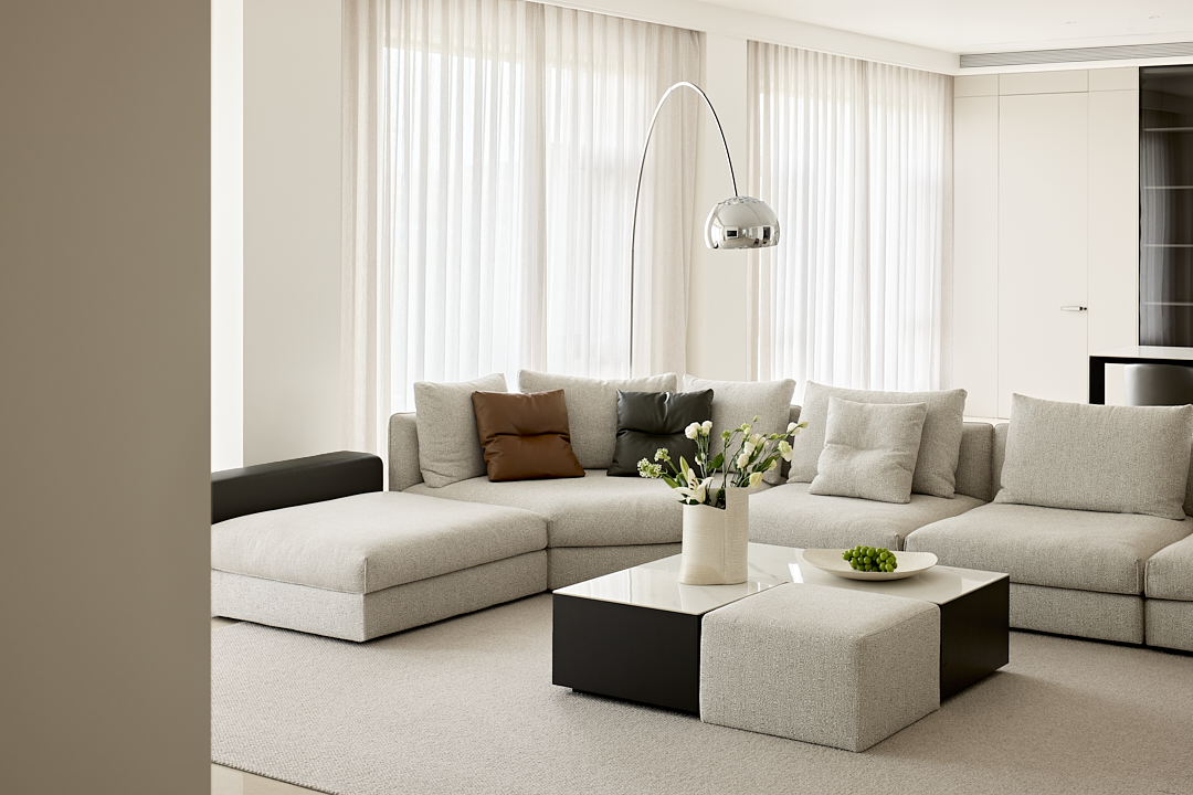 阳光透过窗纱洒落在地面,形成一道道光影,伴随着绿植的点缀,营造出静谧安然的氛围。在此可以让主人,于忙碌的日常生活中,回归片刻的宁静和自我。