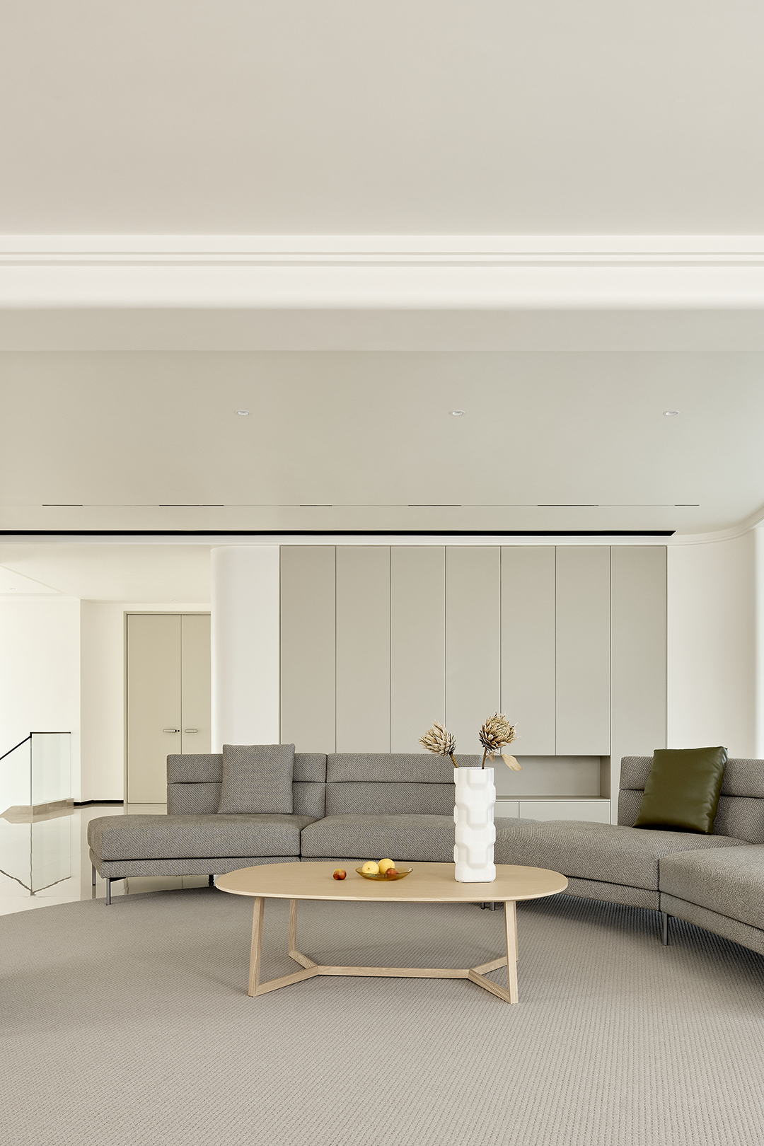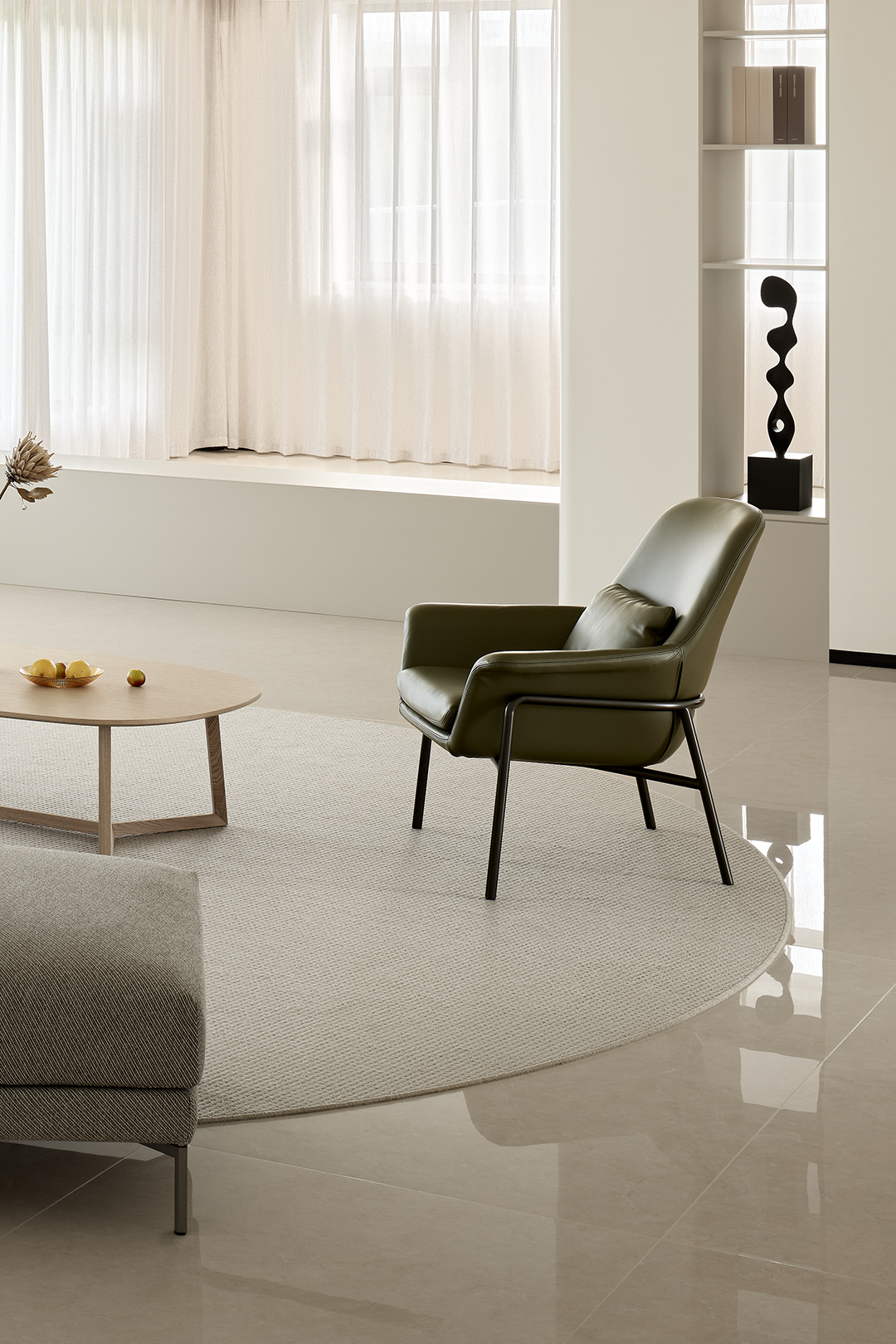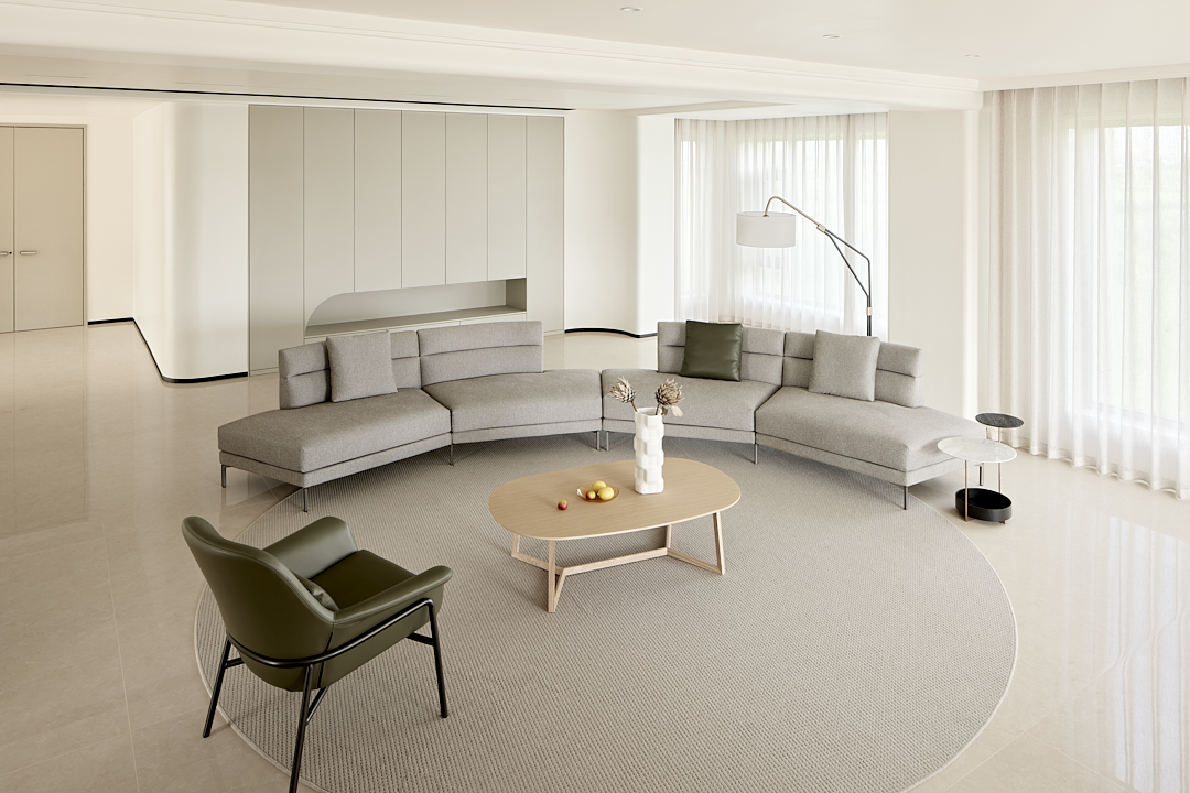 圆形地毯与弧形荣耀体育平台相呼应,不仅起到装饰作用,还在视觉上为客厅空间增添了一份融洽和谐的氛围。