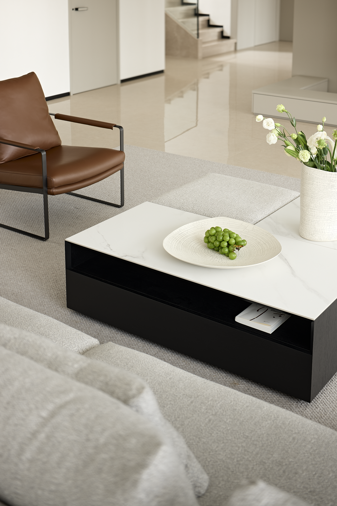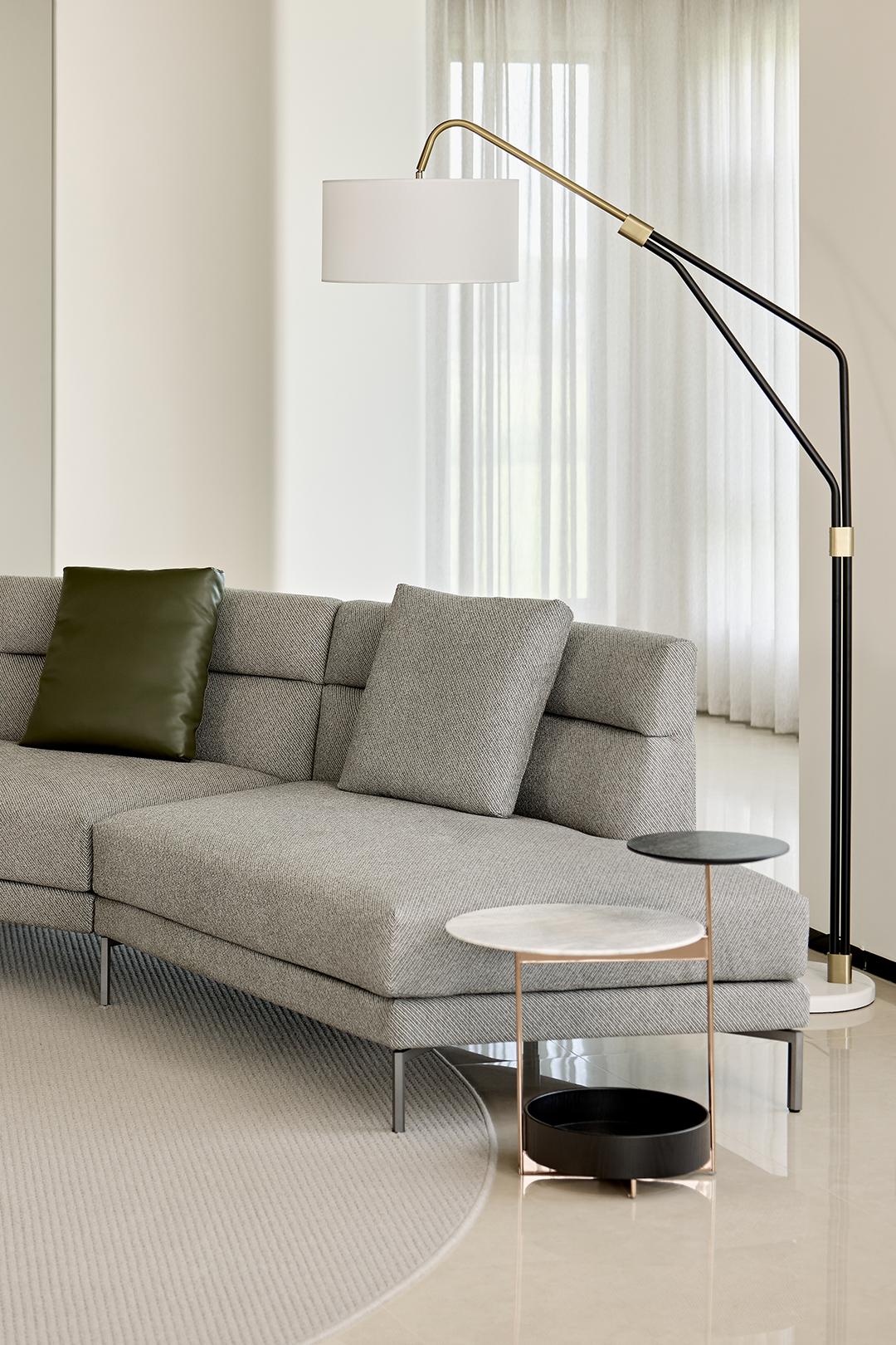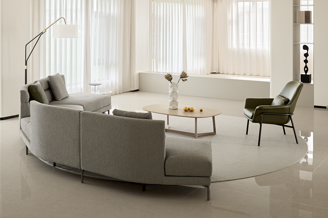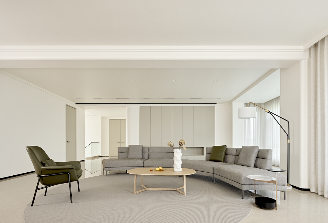 圆形地毯与弧形荣耀体育平台相呼应,不仅起到装饰作用,还在视觉上为客厅空间增添了一份融洽和谐的氛围。
