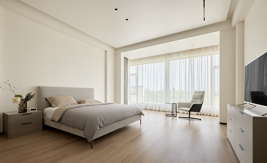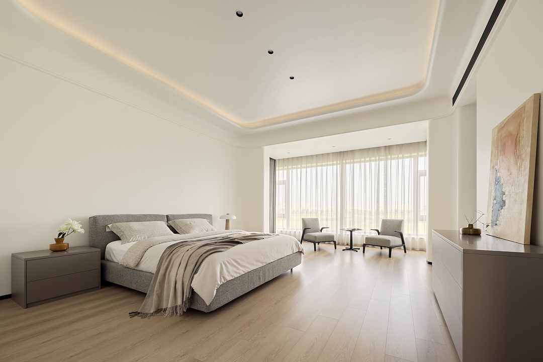 主卧的设计注重整体的和谐,温和且优雅。床尾的装饰画为空间注入了艺术气息,与整体风格相契合,增添了房间的个性化元素。