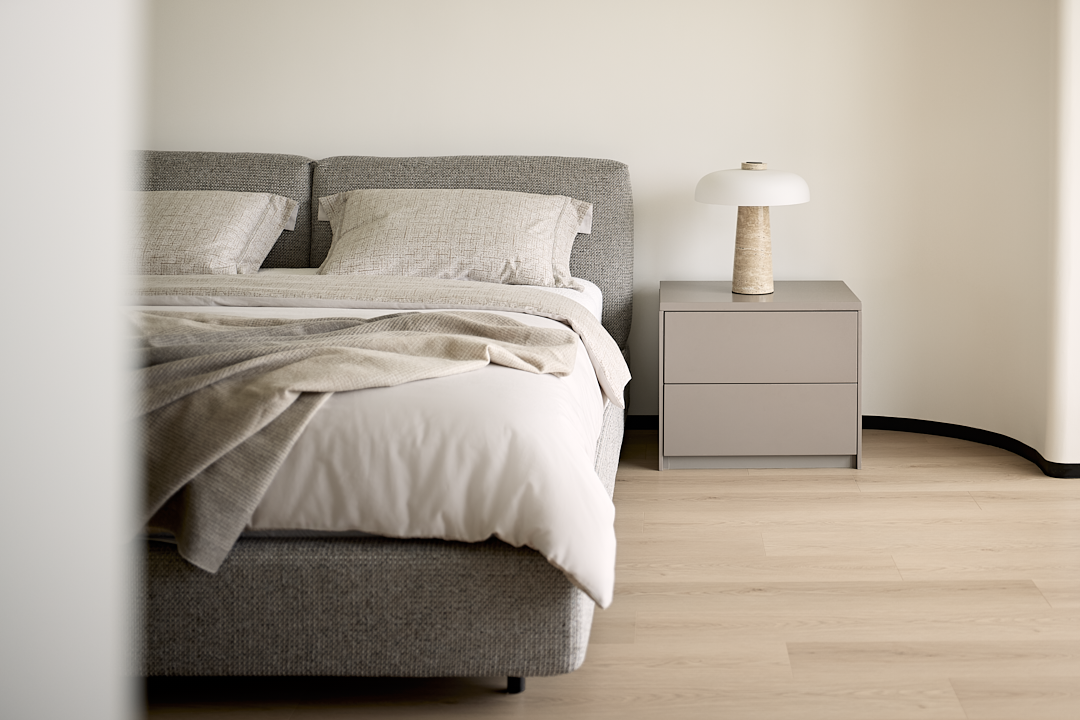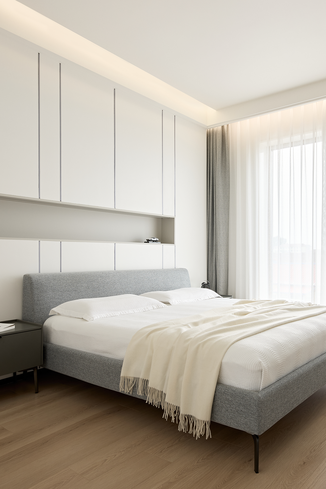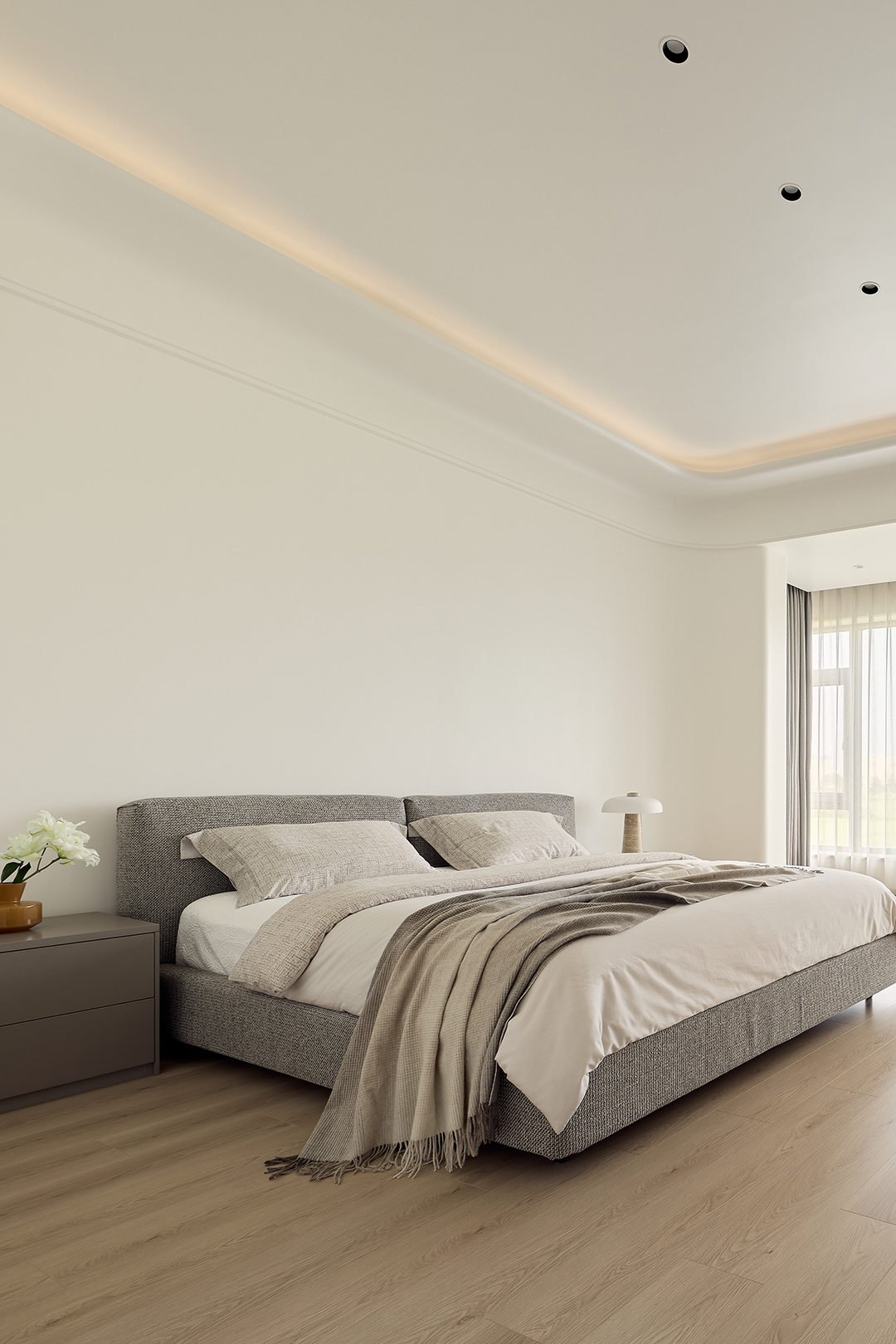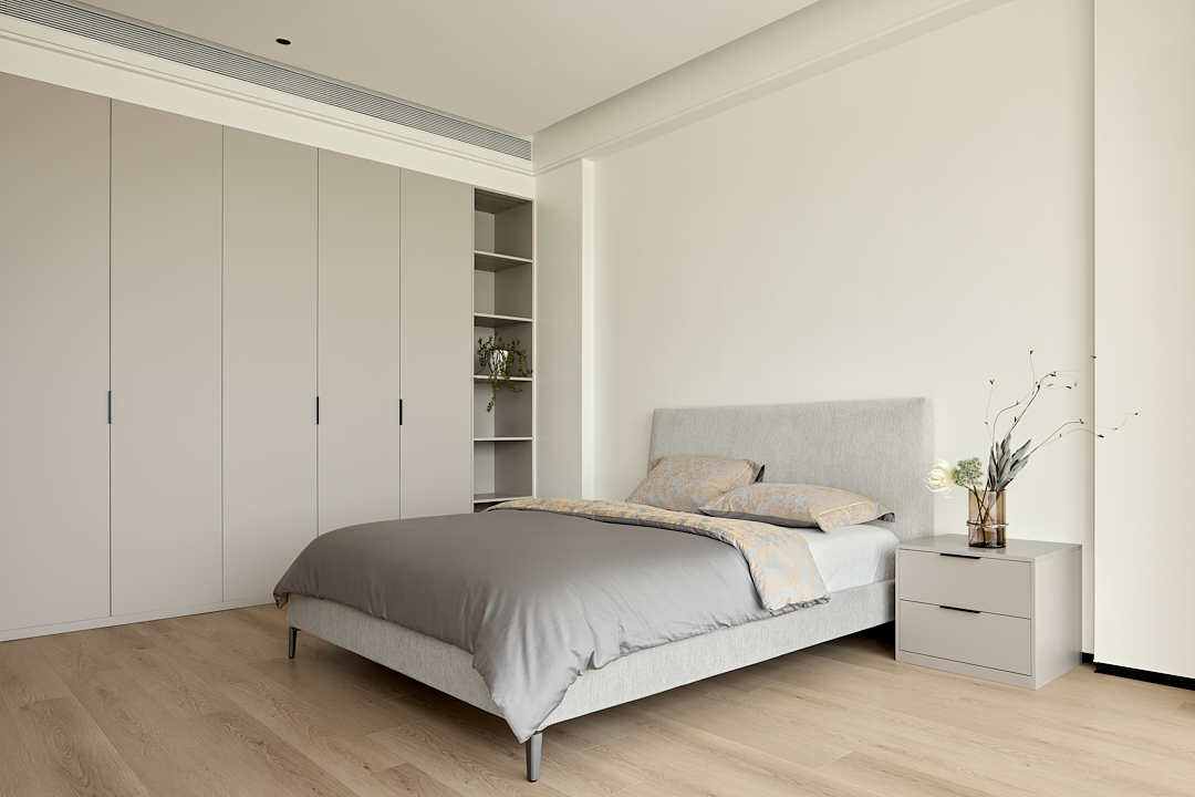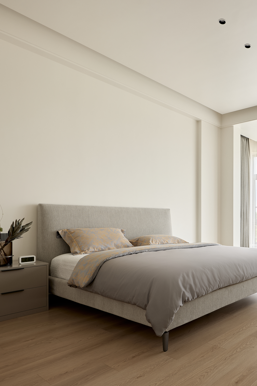 长辈房的设计融合了柔和的色调和温馨的氛围。LUNA伴月床高背的床头设计,为主人带来舒适的坐靠体验。浅灰色的床体与房间的整体色调相呼应,既提升了房间质感,又营造出恬静的睡眠氛围。
