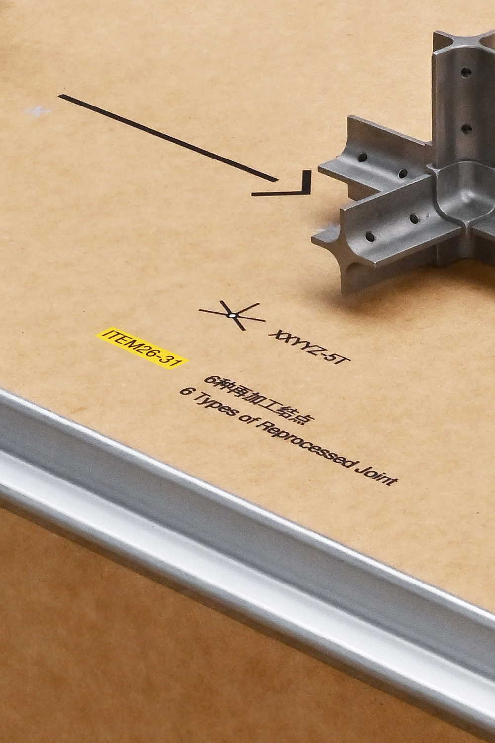 在佛山的“零件车间”,合金铝被加工成X线条和X结点。X线条采用铝挤压工艺,挤压出的型材具有较高的强度和承载能力,并且可根据产品所需的尺寸和螺丝孔位进行精确切割和打孔。X结点则以压铸的方式制作,经打磨喷砂后形成了独特的表面肌理。