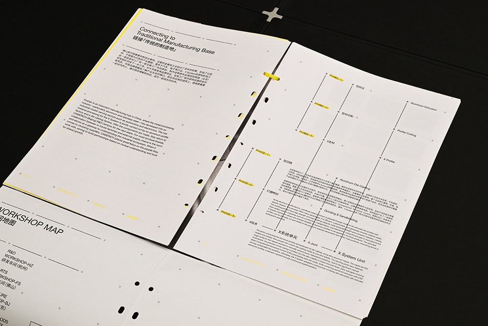 为了更完整而深入地呈现和表达,除了展览现场的视觉与展言的论述之外,magazine into团队还为这次展览策划、设计了《车间手册》。延续“车间”这一概念,手册记录了X System在杭州、佛山、北京、嘉兴4个地点所经历的研发制造工序,结合设计师、供应商、工厂师傅和研发参与者等16人的口述与访谈,形成详实的文本与图像档案。
